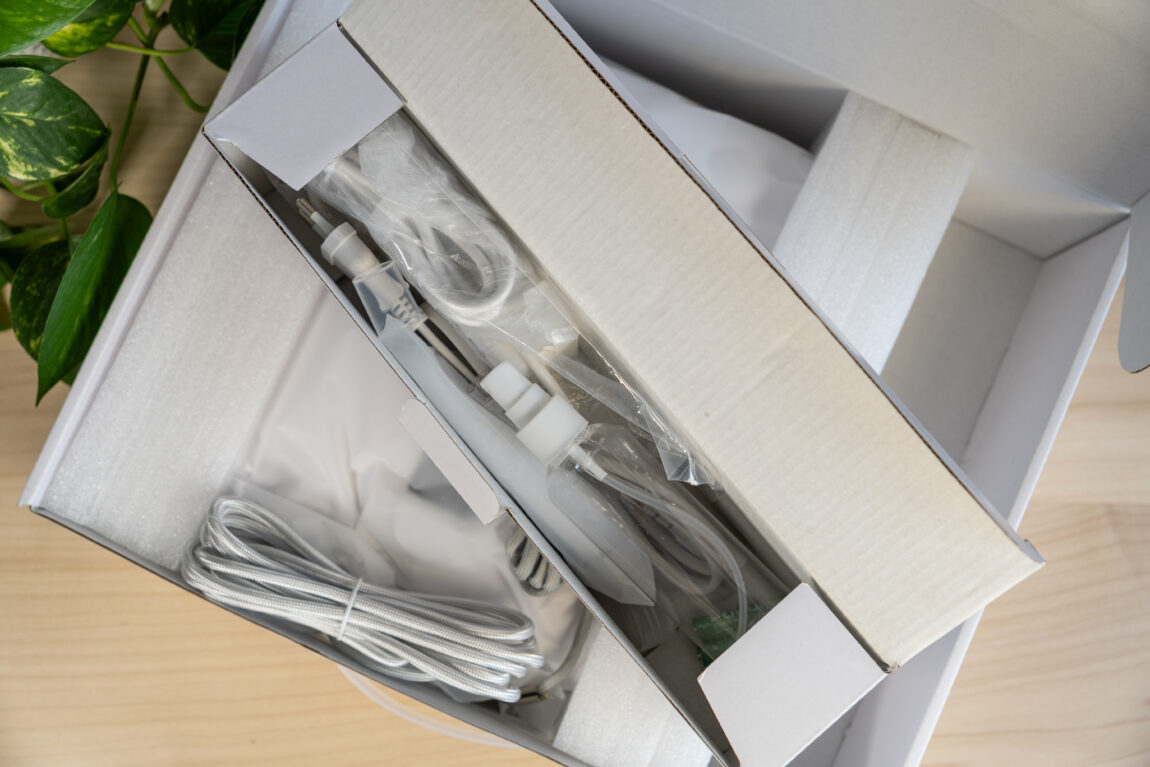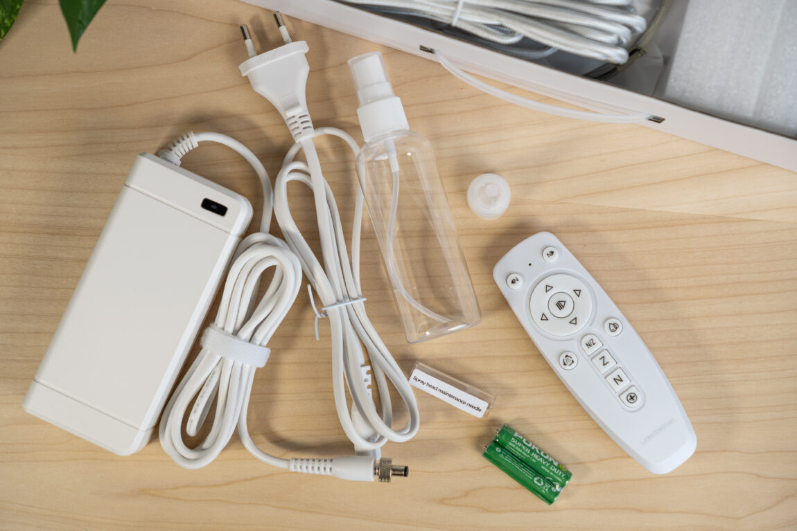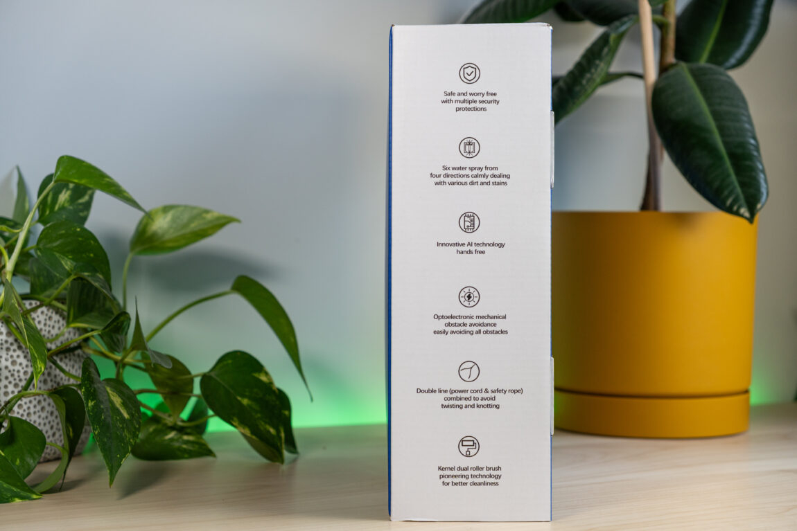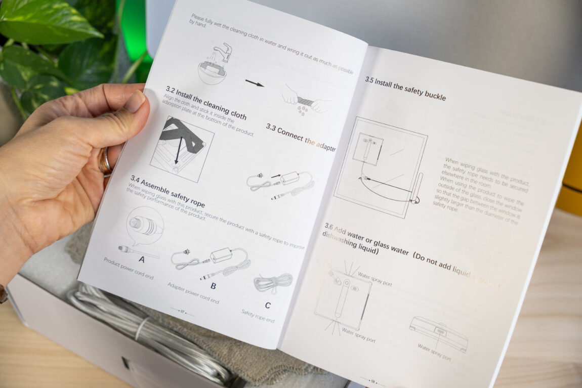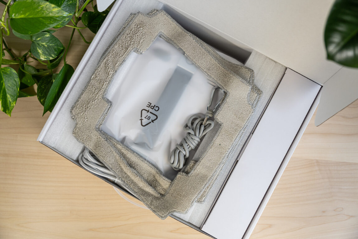 Atidarius dėžę viskas atrodo tvarkingai ir kruopščiai išdėliota. Robotas apsaugotas putplasčiu, o visi priedai mažoje atskiroje dėžutėje. Viduje randu 3 papildomas šluostes, pultelį (su baterijomis, kas jau retenybė), adatą purkštukams valyti ir aiškiai parašytą instrukciją. Nustebino, kad anglų kalba ne „Google Translate” lygio, o tvarkinga, kas prisideda prie kokybiško produkto įvaizdžio.