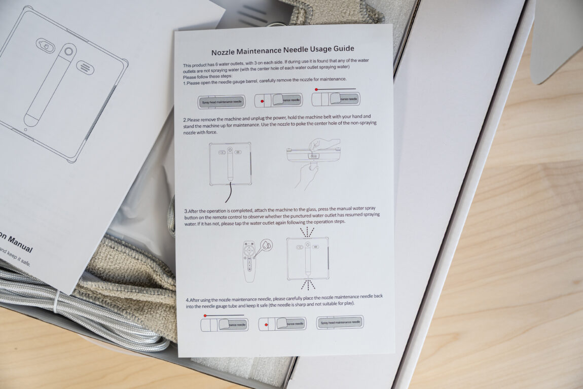 Ir štai kas įdomiausia - robotas puikiai išvalė langus… nors nei vienas purkštukas tuo metu neveikė. Iš esmės, šlapia šluostė ir voleliai paliko langus tiesiog spindinčius. Apžiūrėjus iš išorės nesimato nieko, dėl ko purkštukai turėtų neveikti, tad išbandžiau ir komplekte esančią adatą, be apčiuopiamo rezultato.