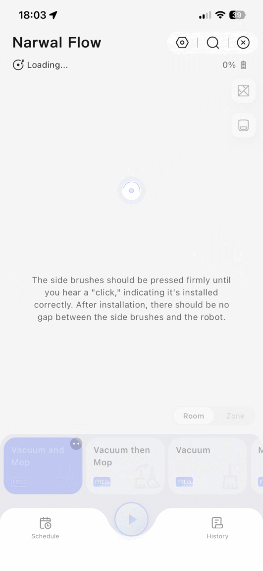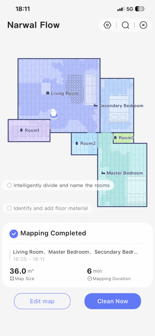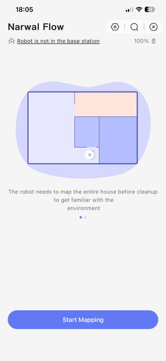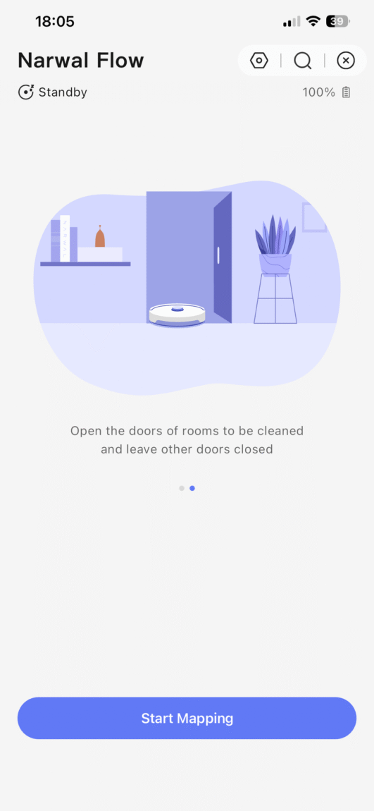Narwal Flow valdomas per Narwal Freo programėlę - tą pačią, kaip ir Z serijos modeliuose. Sujungimas su siurbliu paprastas ir vykdomas vedlio pagalba. 68 m² buto žemėlapis sudaromas per 5 minutes ir jis ganėtinai tikslus. Po smulkių korekcijų, robotas siurblys paruoštas pirmam darbui per 10 minučių.