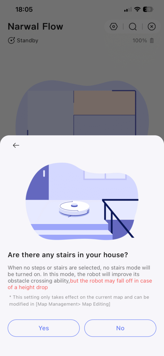Taip pat, jei kliūtis valymo metu neleidžia patekti į patalpą, Narwal Flow į ją nebesugrįžta. Jei tai ne paskutinė valoma patalpa, norėčiau, kad robotas patekti pabandytų dar kartą.
