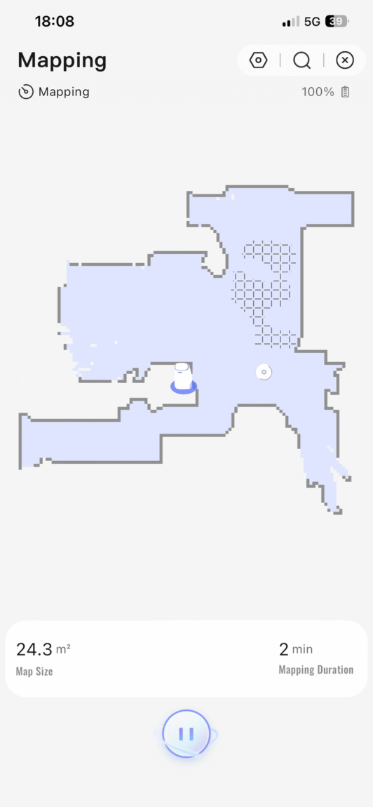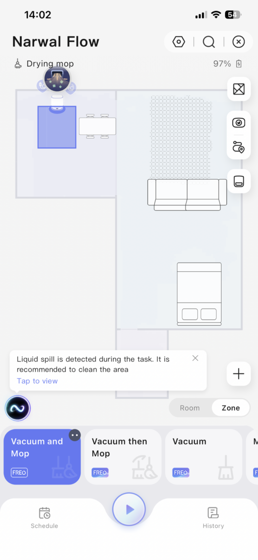 Svarbu atkreipti dėmesį, kad pagal gamyklinius nustatymus Flow kilimus praleidžia, tad jei norite, kad jie būtų valomi, juos reikia pažymėti kaip valomus rankiniu būdu. Programėlės sąsaja išlieka aiški ir paprasta: galima pasirinkti siurbimą, plovimą arba abu kartu, reguliuoti intensyvumą, drėgnumą ir kitas parinktis. Freo Mind automatinis režimas veikia puikiai - dažniausiai papildomai nieko keisti nereikia.