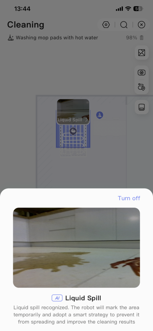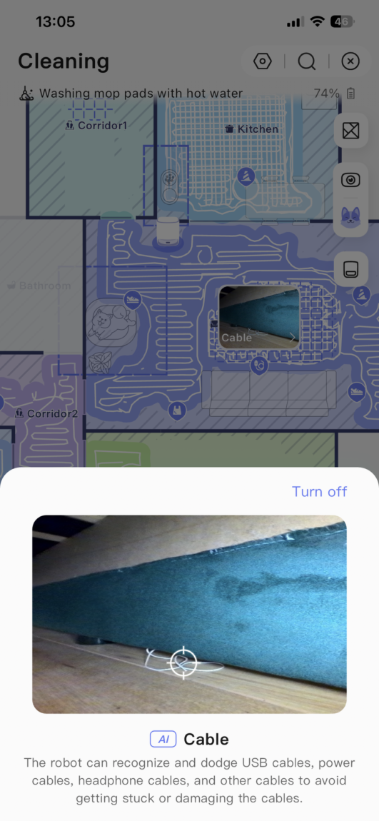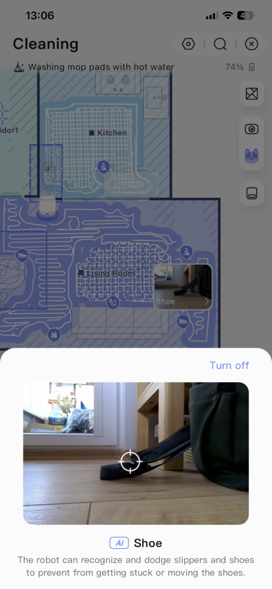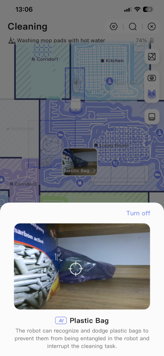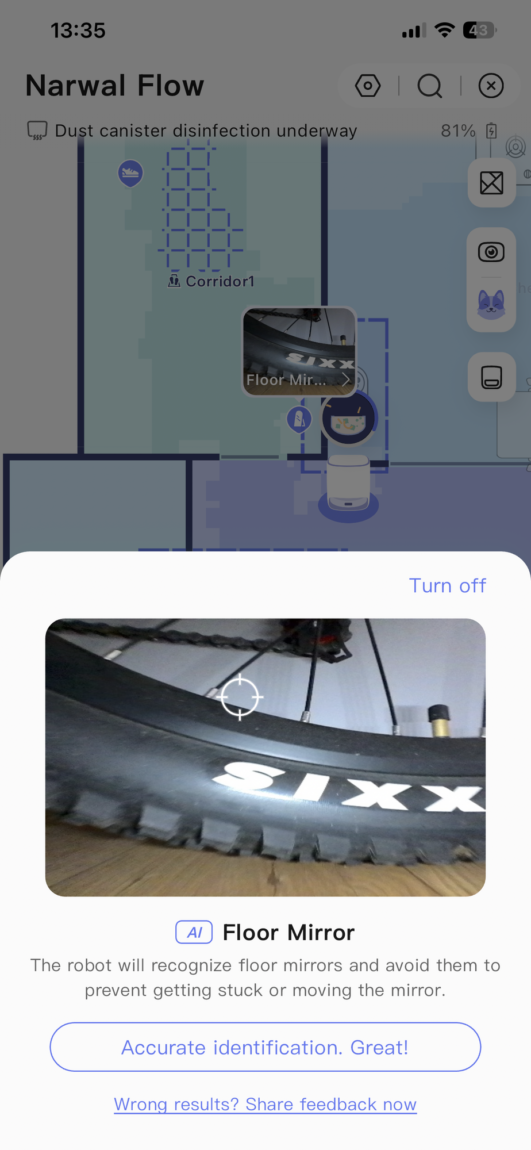 Nepaisant to, su Narwal Flow praleidus gerą mėnesį itin didelių problemų su navigacija nepastebėjau. Siurblys nesusiduria su gyvūnais ar žmonėmis, tačiau objektų atpažinimas veikia prasčiau nei Z serijoje. Pavyzdžiui, dviratis atpažintas kaip veidrodis, o užuolaidos - kaip laidas.
