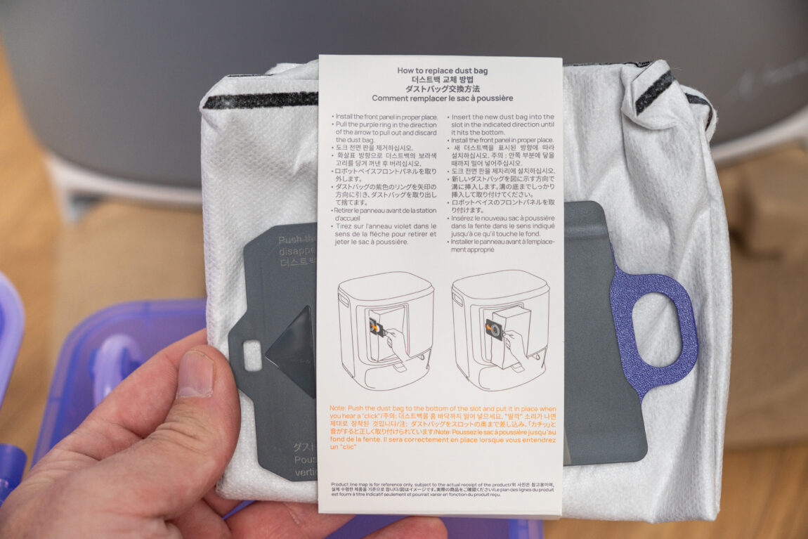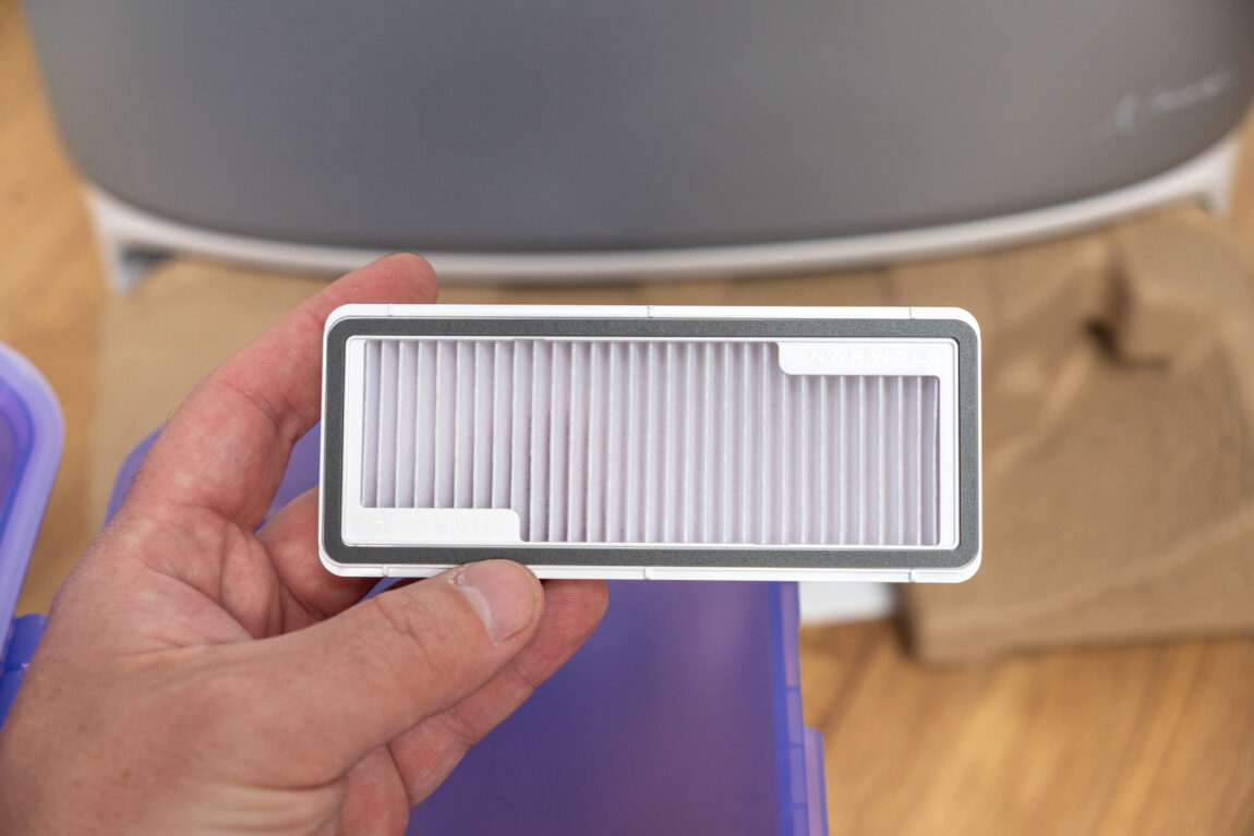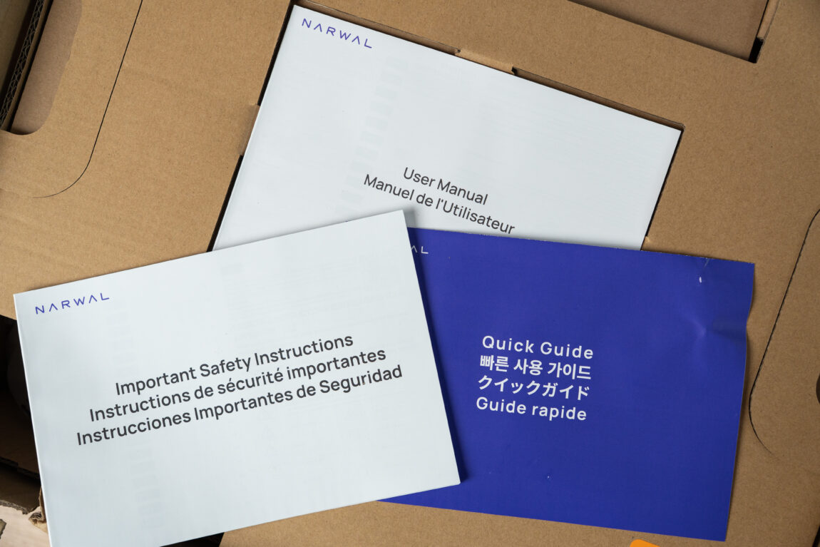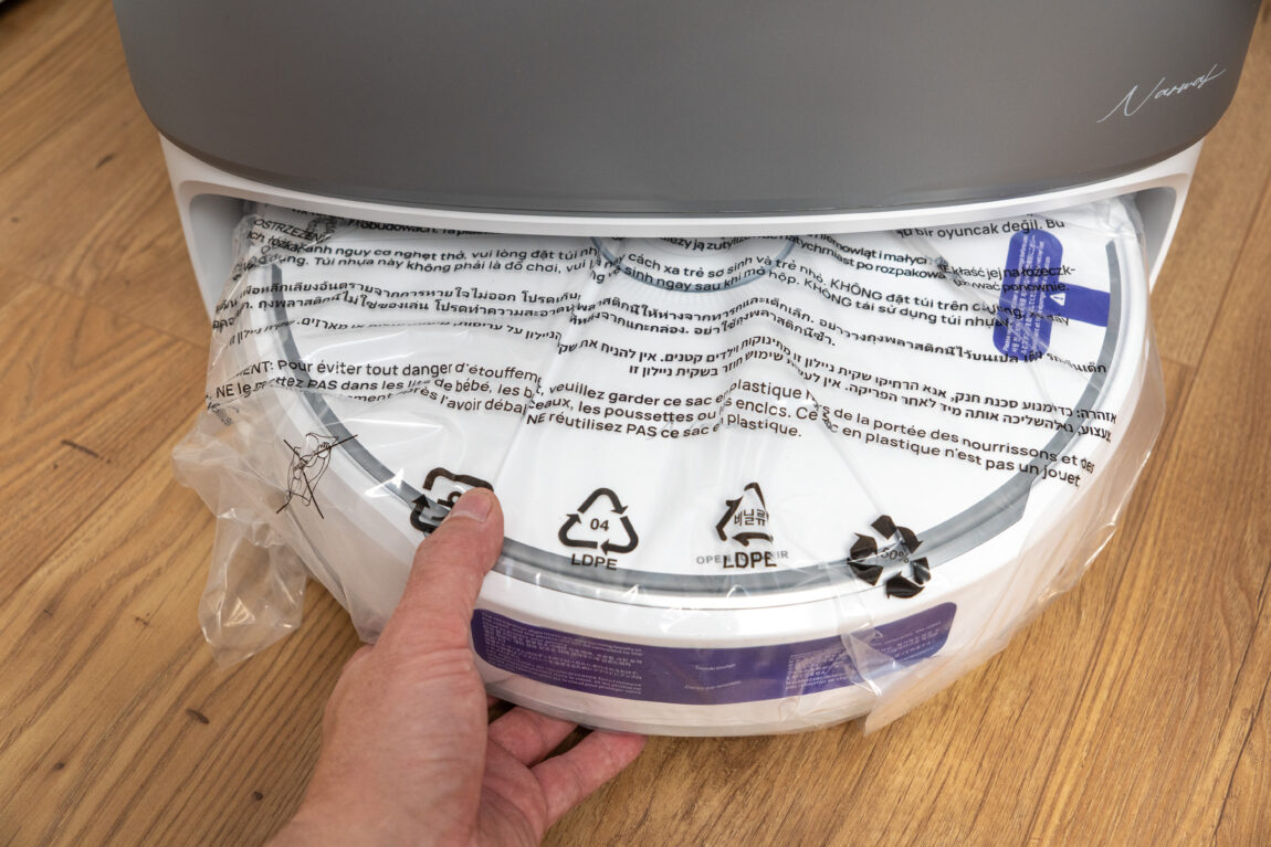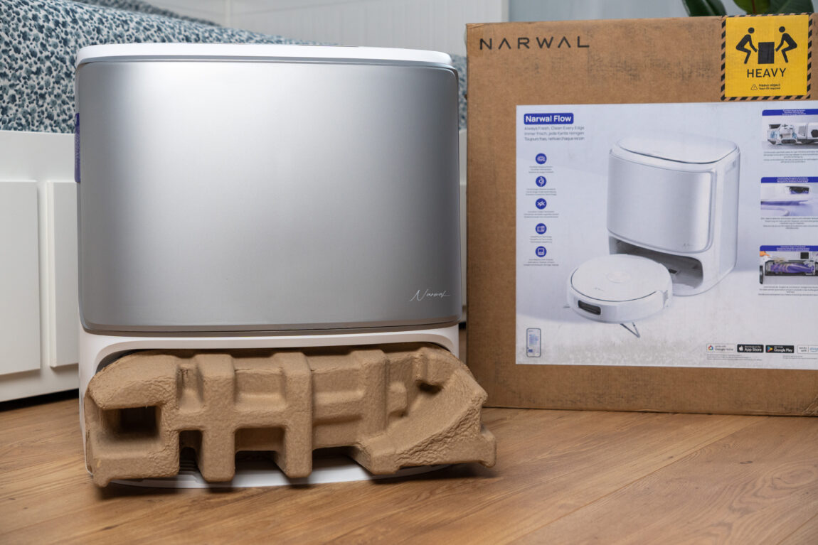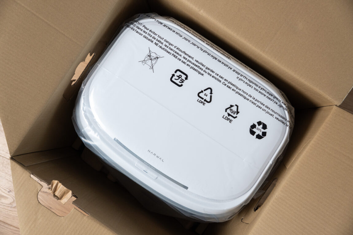 Narwal išpakavimo patirtis išlieka tokia pati gera, kaip ir anksčiau - viskas sudėliota tvarkingai, saugiai ir apgalvotai. Nors dėžės kampas buvo pažeistas transportavimo metu, turinys nenukentėjo. Viduje visi reikalingi priedai bent porai mėnesių naudojimo: papildomas dulkių maišelis ir grindų ploviklis stotelei, dulkių konteineris ir atsarginis filtras pačiam robotui.