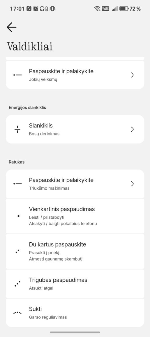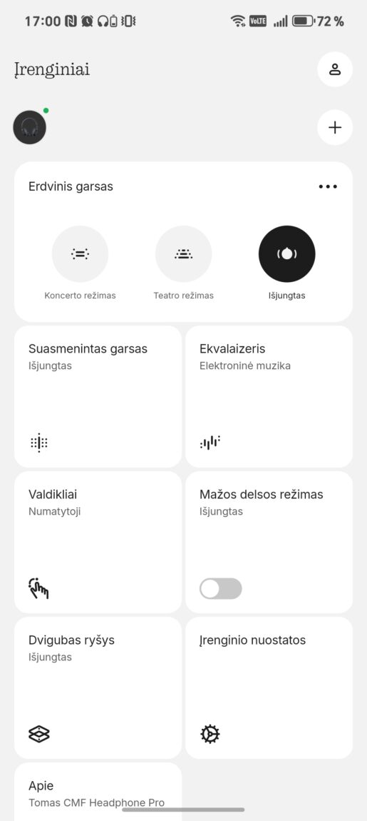Atsisiuntus šią programėlę nekils didesnių vargų ją susieti su ausinėmis. Prijungimas paprastas ir greitas, o tai leis naudotis įvairiomis funkcijomis ir keisti nustatymus. Ši programėlė rodo jūsų turimus ir suporuotus įrenginius. Atsidarius savąjį įrenginį (šiuo atveju Nothing ausines) iškart matysite jo atvaizdą ir baterijos įkrovos lygį. Paspaudus prijungto prietaiso ikonėlę, būsite nukreipti į valdiklių funkcijų koregavimo meniu. Čia pagal savo poreikius galėsite pasirinkti, kokias funkcijas atliks kiekvienas mygtukas esantis Nothing CMF pro ausinėse.