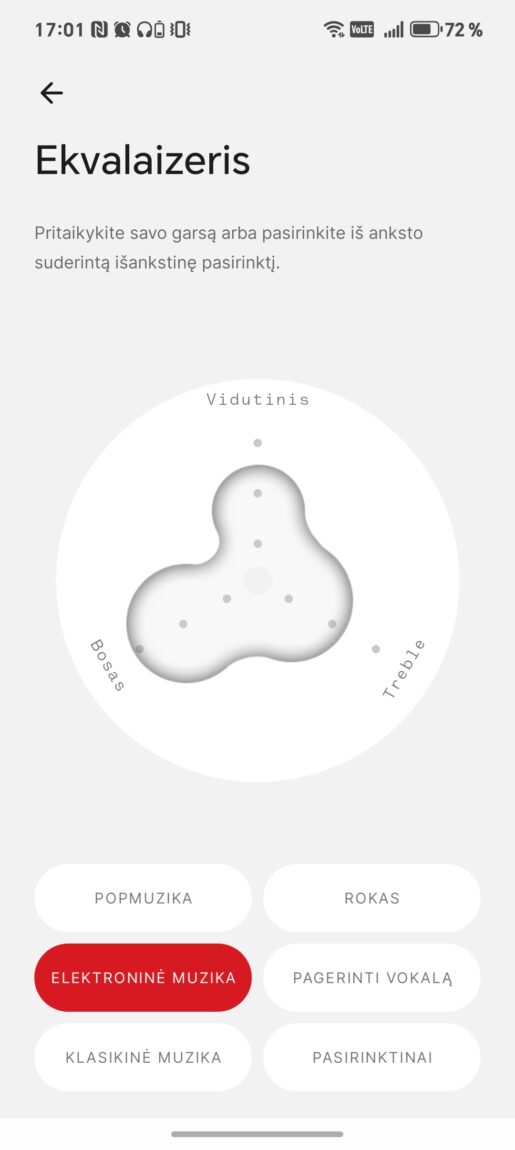 Grįžus į pagrindinį langą turėsite prieigą prie visų turimų funkcijų ir garso nustatymų. Įjungę erdvinio garso funkciją galėsite pasijusti lyg teatre ar koncerte. Taip pat čia turime penkių rūšių ekvalaizerio preset’us: roko stiliaus, popmuzikos, elektroninė muzika, sustiprinto vokalo ir klasikinės muzikos. Neatradus aukso viduriuko, galima garso juostas koreguoti ir pagal savo poreikius. Jeigu visgi neatrandate sau patinkančio garso ir balanso, galite išbandyti suasmeninto garso funkciją, kuri padės atrasti puikų skambesį pagal jūsų pačių klausą ir ausų jautrumą.