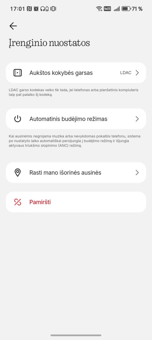 Komfortas išlieka didelis, nes pagalvėlės minkštesnės nei Soundcore, todėl ilgesnio klausymo metu ausinės patogios. Vienas ryškesnių trūkumų – transportavimo sprendimas: vietoje kieto dėklo gauname tik maišelį, tad kelionėms tai nėra pats saugiausias variantas. Kitas aspektas – balso pranešimai, girdimi perjungiant triukšmo slopinimo režimus, kurie laikui bėgant gali šiek tiek erzinti.