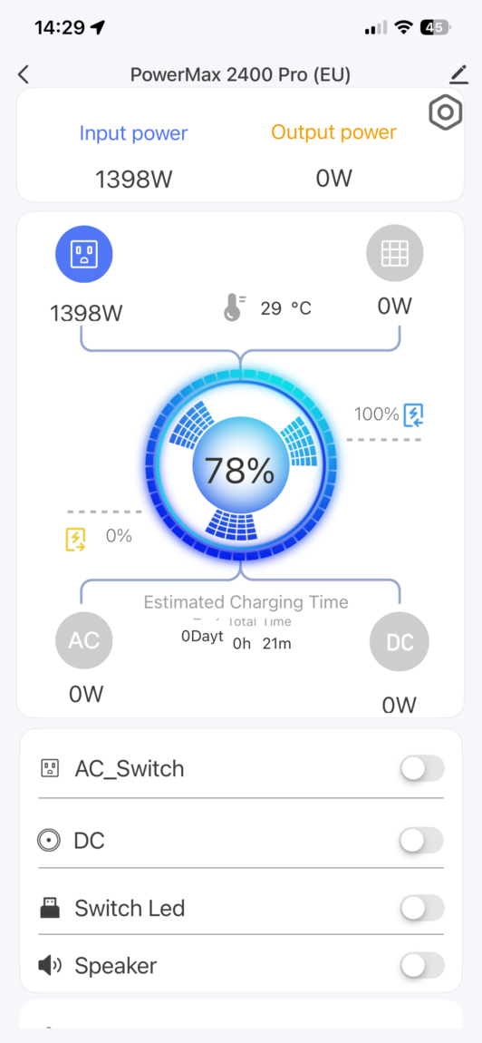 Įkrovimo greitis taip pat nenuvilia. Naudojant kintamosios srovės (AC) įkrovimą, PowerMax kraunamas maždaug 1400 W galia (galima reguliuoti programėlėje nuo 100 W iki 1400 W), o pilnas įkrovimas trunka apie 1,5 valandos. Palyginimui, Bluetti Elite 200 V2 čia šiek tiek lenkia su 1800 W įkrovimu.