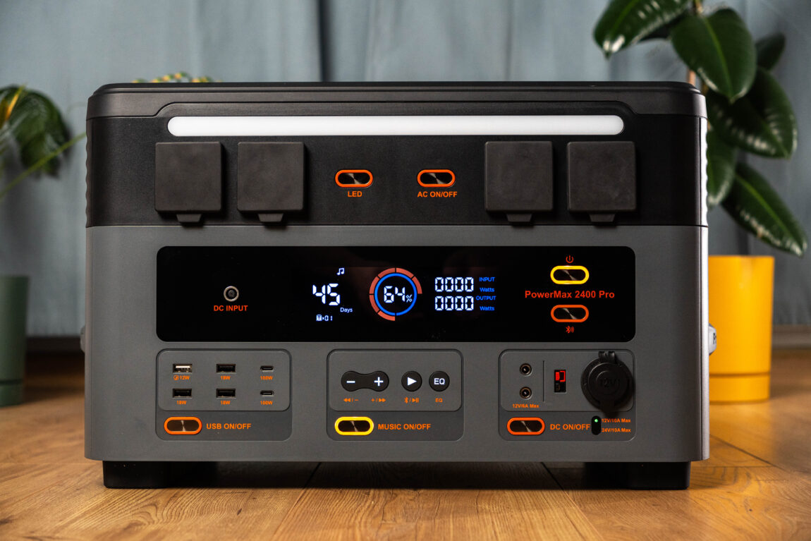 Iš arčiau apžiūrėjus PowerMax 2400 Pro, pirmasis įspūdis išlieka pakankamai teigiamas. Dizainas modernus, su akcentinėmis spalvomis, vizualiai tvarkingas ir iš pirmo žvilgsnio galintis priminti mobilią kolonėlę - ypač dėl šonuose esančių grotelių, imituojančių garsiakalbius. Tai suteikia tam tikro išskirtinumo ir leidžia stotelei neatrodyti kaip eiliniam techniniam įrenginiui, kurį norėtųsi paslėpti nuo akių.