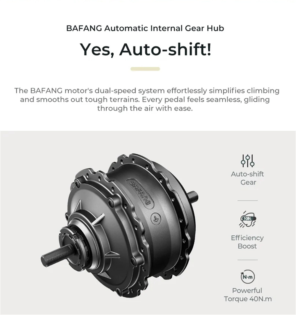 The bike is equipped with a Bafang 250W rear motor with 40 Nm of torque, making it easy to ride at a daily pace. A great feature is the automatic 2-speed system: the bike itself selects the most appropriate „gear“ according to speed and terrain, without any manual shifting. When reaching approximately ~18 km/h, the system automatically switches to make pedaling smoother and more comfortable. Maximum assistance speed – 25 km/h.