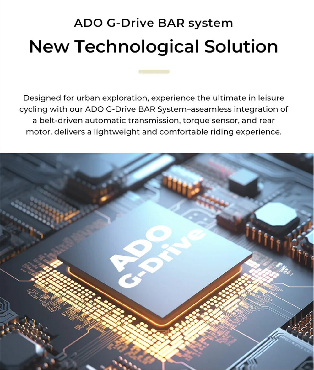 ADO G-Drive is an intelligent control algorithm that helps the motor work more smoothly and efficiently. It contributes to more natural acceleration, especially when starting off and changing pace. When riding in the city, this results in less jerking and a more predictable response to pedaling rhythm. Simply put, the bike feels „smarter“ and more comfortable.
