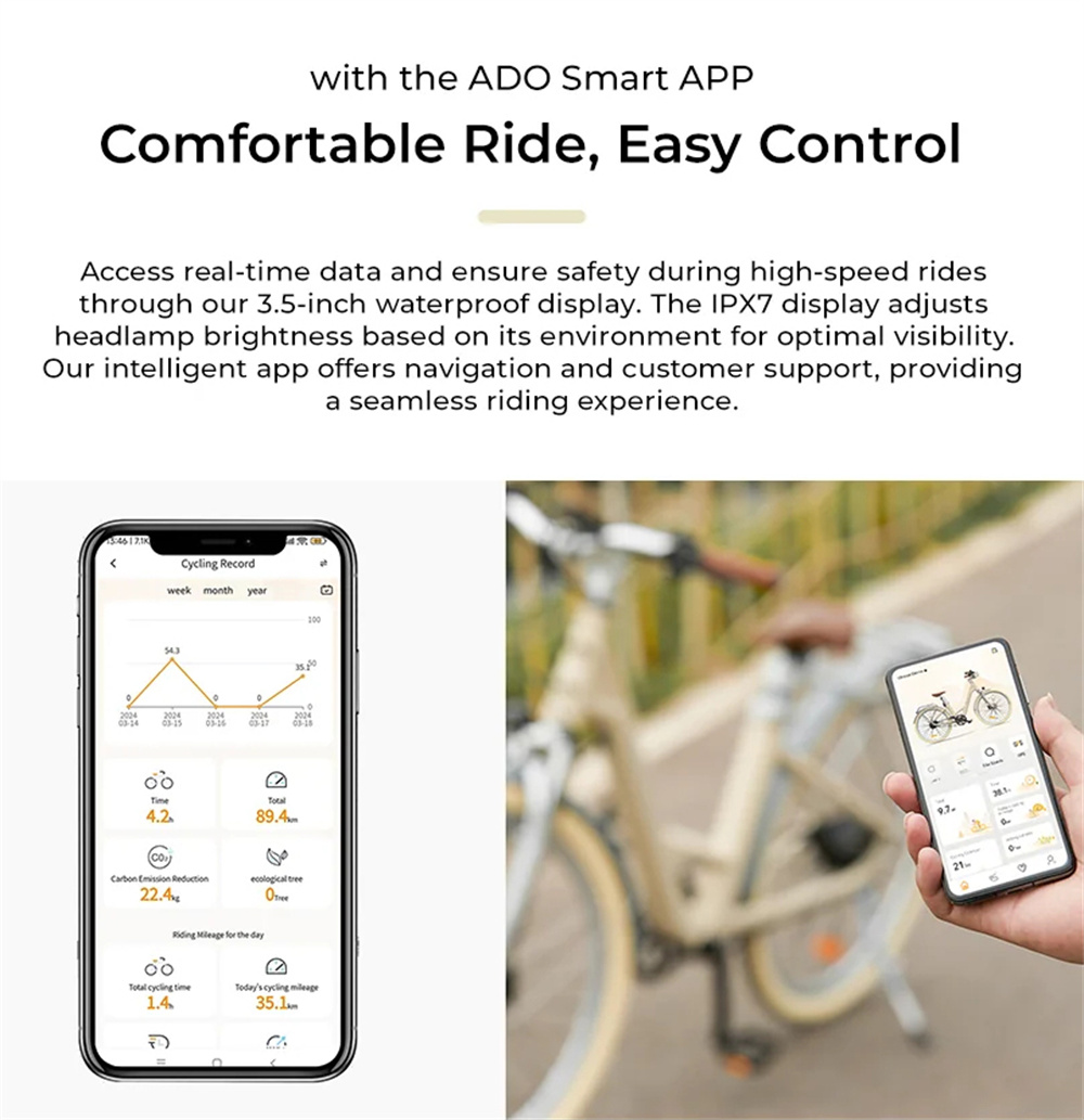 ADO Smart APP allows you to more conveniently monitor driving statistics and manage basic settings. The app allows you to see the distance traveled, speed, battery information and other trip data. It is also convenient that you can control some functions directly from your phone, and the display on the handlebars remains clear for everyday use. If you like to have control and statistics in one place, this app is really useful.