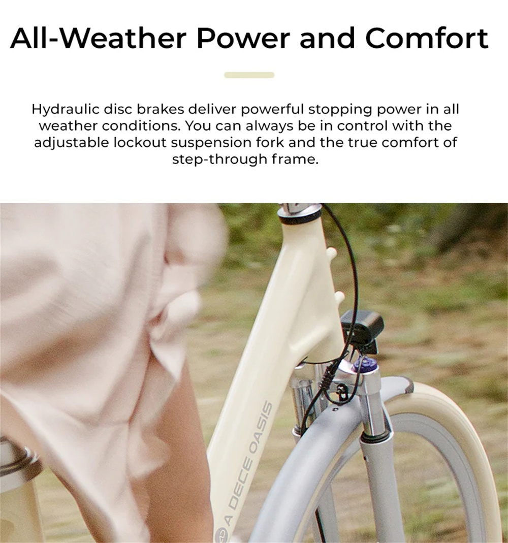 Hydraulic disc brakes provide more precise and confident braking, especially in wetter weather. There is a shock-absorbing fork at the front that absorbs curbs and minor bumps, so your arms get less tired. This is not a mountain bike sports suspension, but it is more than enough for the city and park trails. It is simply more comfort and control every day.