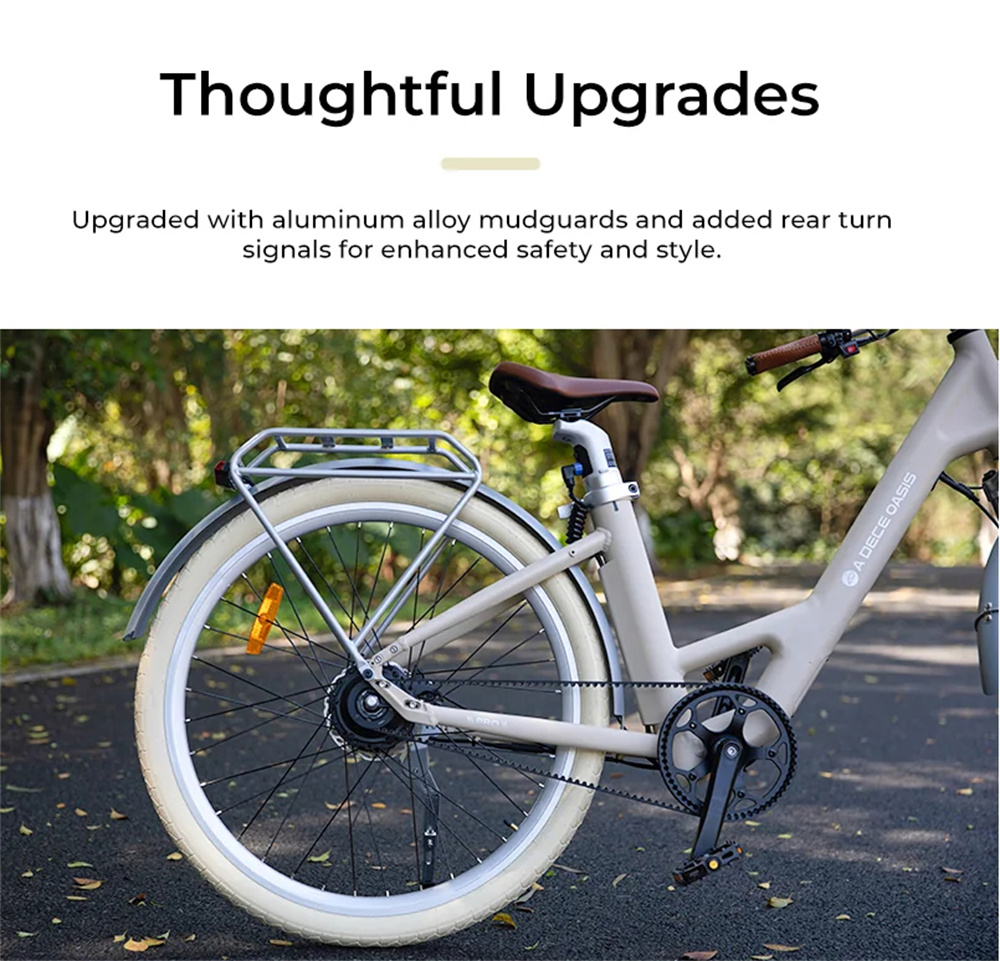 The carbon belt is one of the biggest pluses: it runs quieter, doesn't require lubrication and doesn't collect as much dirt as a chain. The included mudguards are useful when riding in wetter conditions, and the rear rack allows you to comfortably carry a backpack/bag. The integrated turn signals in the rear light add safety in the city when you need to clearly indicate a maneuver. This is a practical kit for everyday use, not just "looking good".