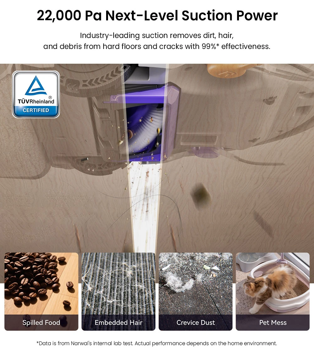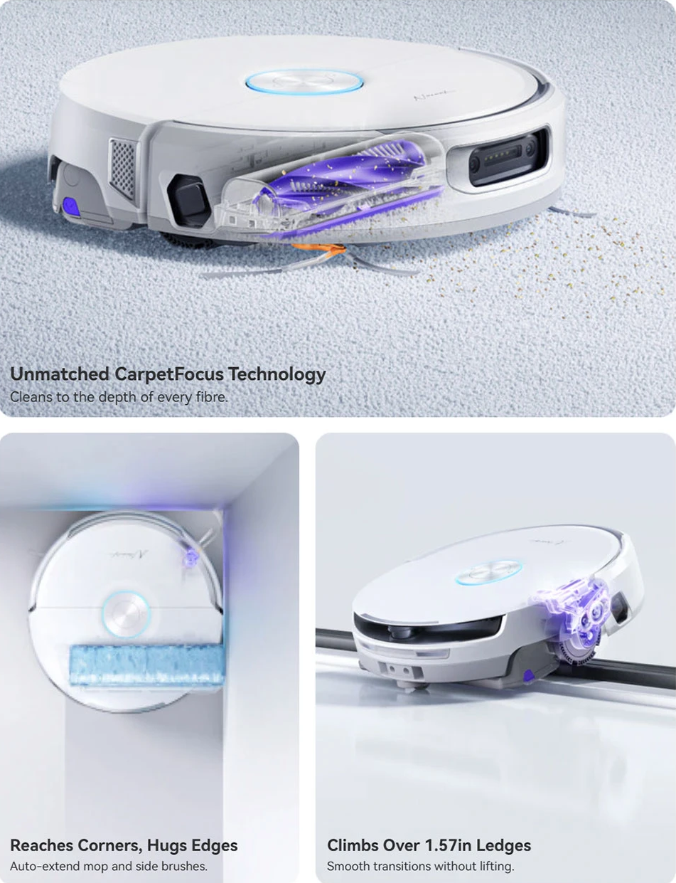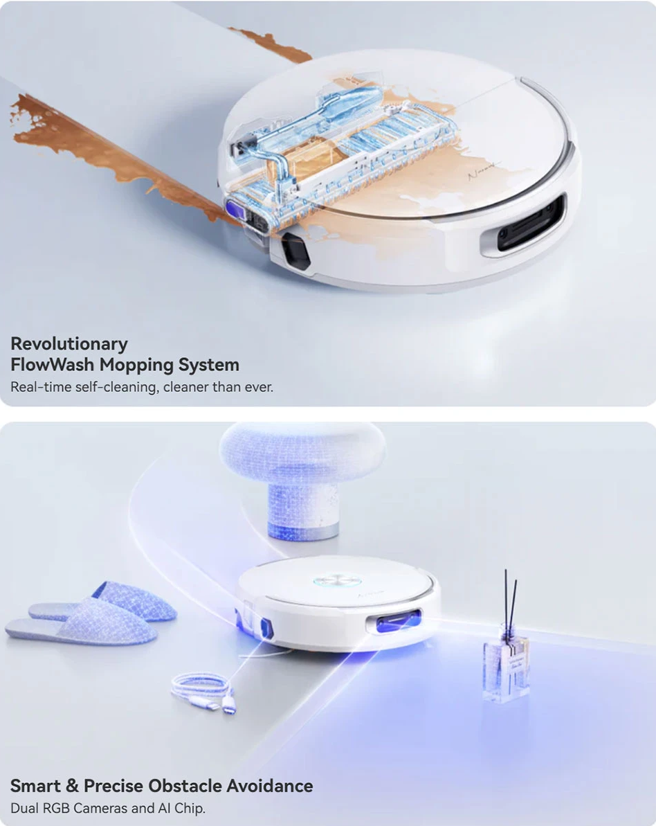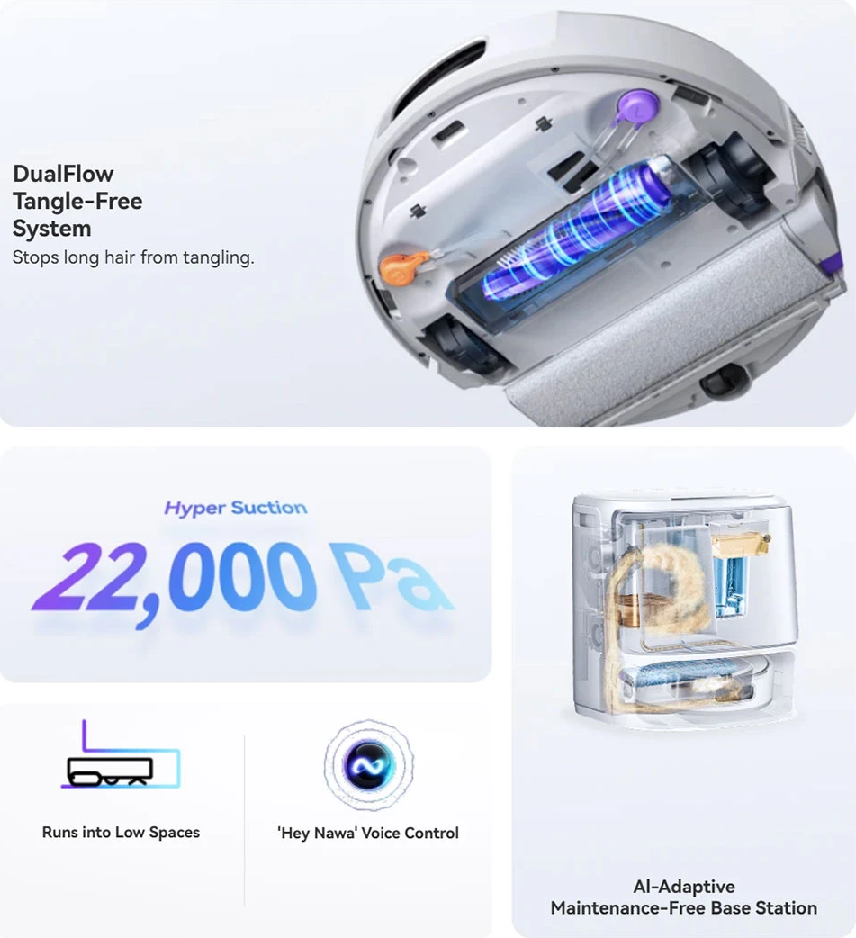 Main parameters: up to 22,000Pa suction power, new generation wet cleaning function with mop lifting technology, hair-free main brush with patented technology, automatic cleaning station (refilling the water tank, dispensing cleaning liquid, cleaning and drying the wet mop), 3D home scanning lasers, obstacle detection sensors, smart control via APP.