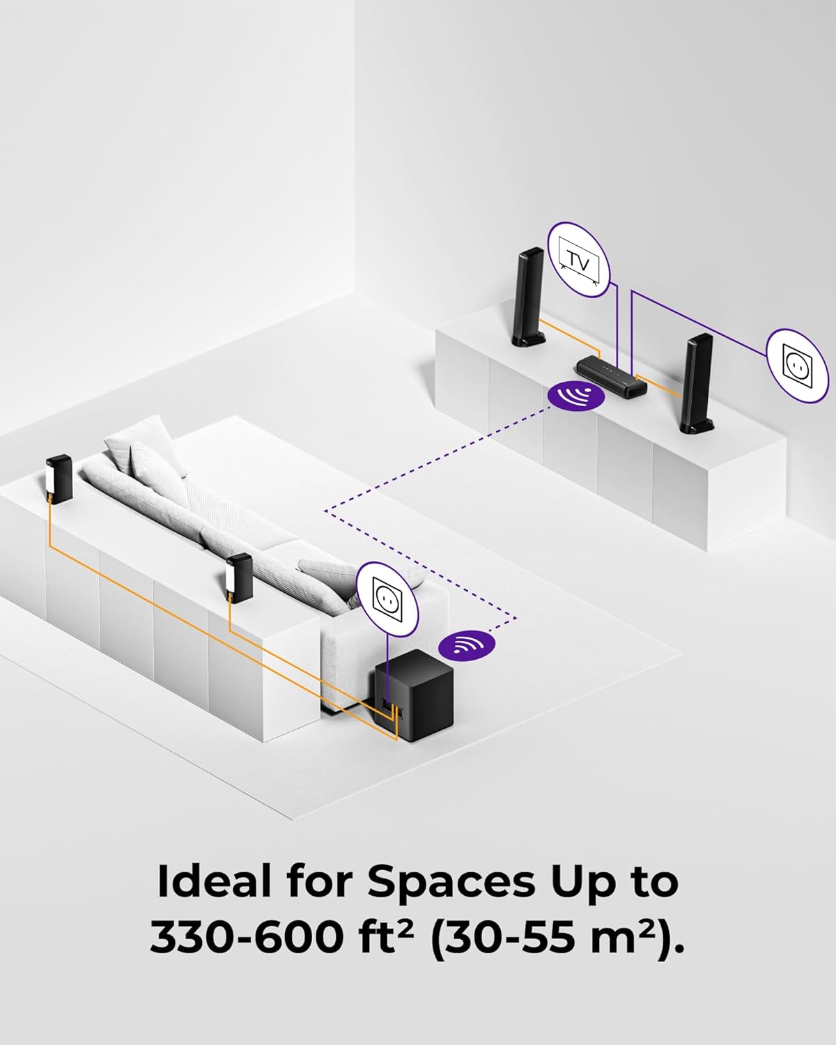 The system supports HDMI eARC, optical, AUX and USB connections, making it easy to connect to a TV or other devices. Separate rear speakers connect wirelessly, so there is no need for additional cables. ULTIMEA Apollo S90 is recommended for rooms up to 55 m² - a perfect choice for spacious living rooms or cinema rooms.
