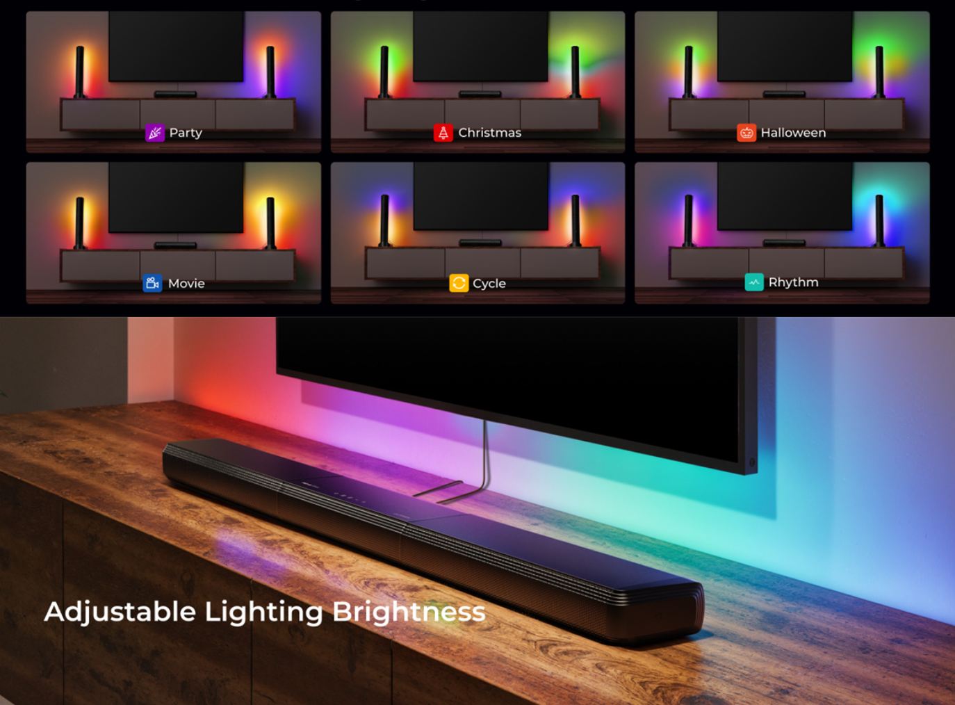 The integrated RGB lighting gives the system a modern look and creates an atmosphere according to the mood. You can choose the desired color or a dynamic light effect that reacts to the rhythm of the music. The lights complement the sound experience and turn the evening into a real show.