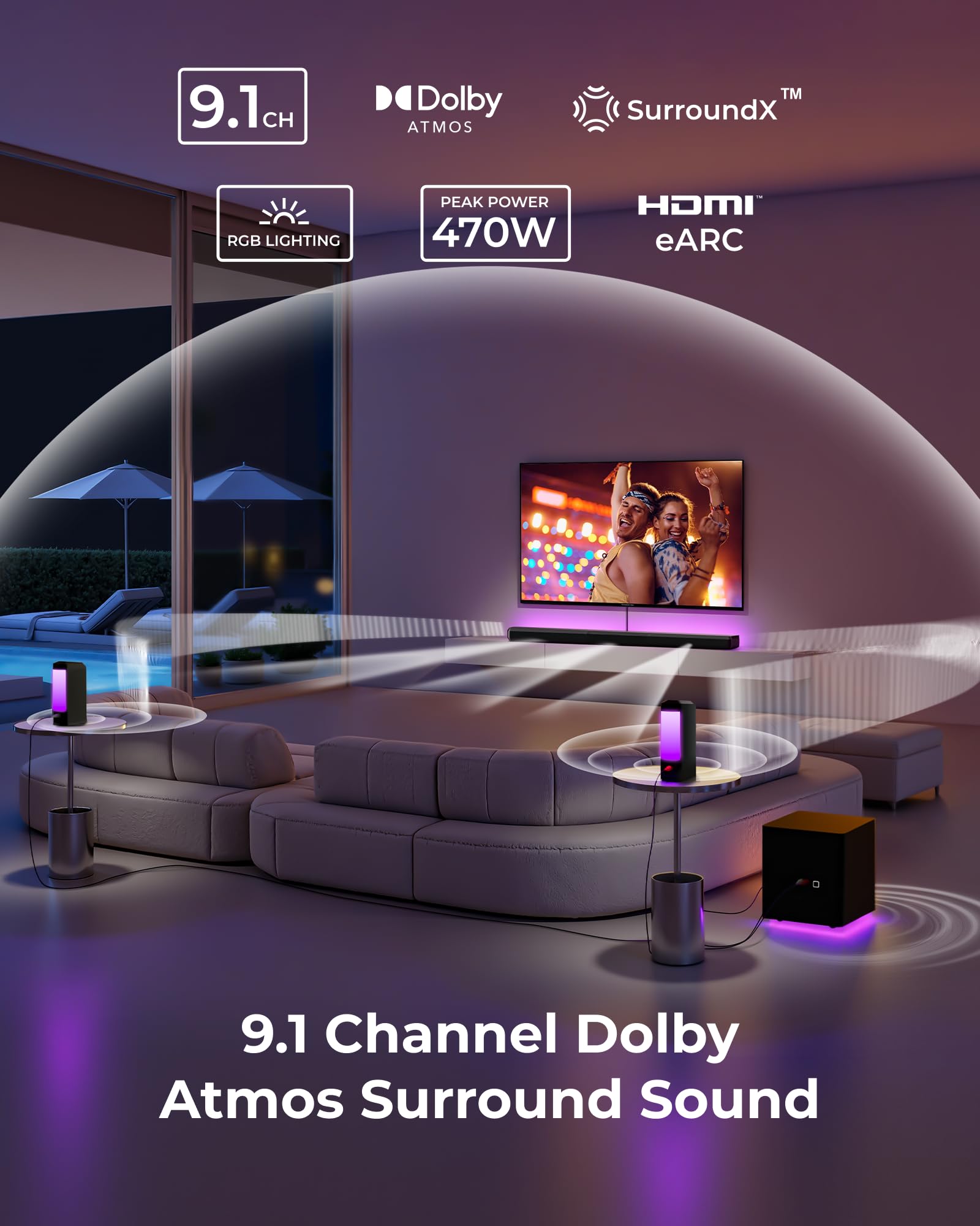The ULTIMEA Apollo S90 is an advanced 9.1 Dolby Atmos sound system designed for home theater. With an impressive 470W of power and separate surround speakers, this system delivers realistic, room-filling sound. Whether you're enjoying movies, games, or music, this sound system transforms your living room into a true cinematic center.