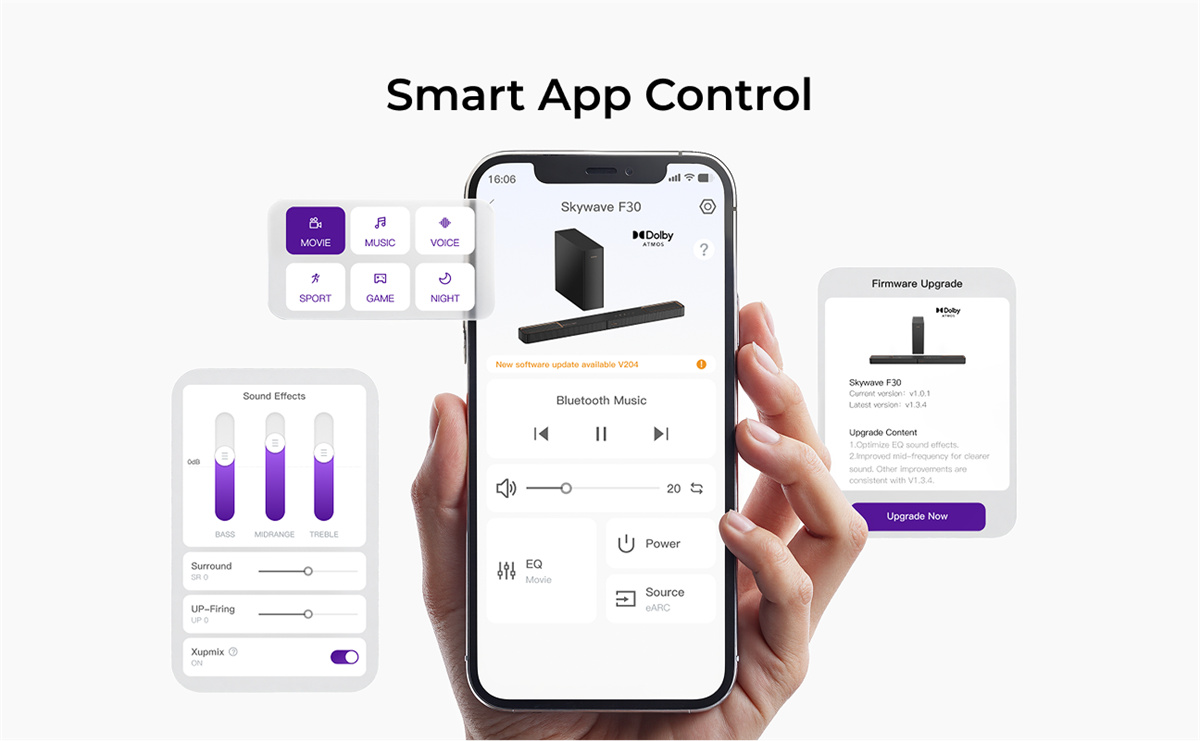 The Skywave F30 features Smart Dialogue Enhancement technology that automatically enhances voices and dialogue. It filters out unnecessary background noise, making speech clearer and more intelligible even in complex scenes. This is a great solution for those who want to hear all the dialogue without having to constantly adjust the volume.