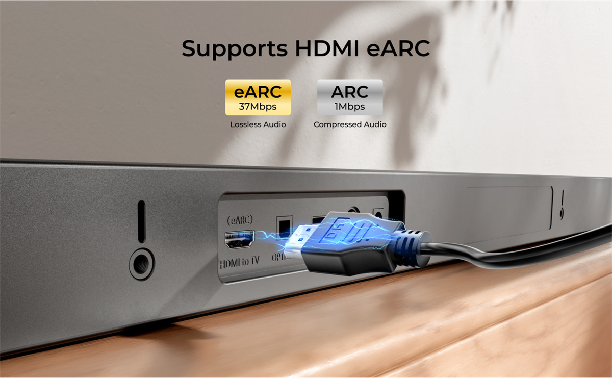 The sound system supports HDMI eARC, allowing you to stream high-quality Dolby Atmos audio without any lag. In addition, the F30 has optical, AUX and USB inputs, making it easy to connect to a variety of devices - from a TV to a game console or computer. eARC technology ensures maximum sound resolution and a reliable signal.