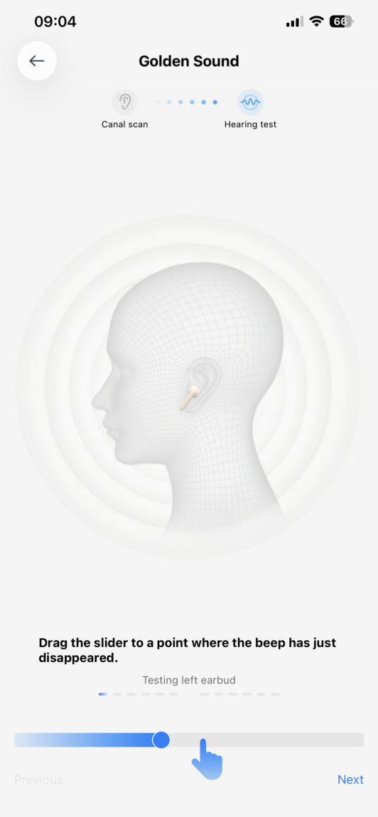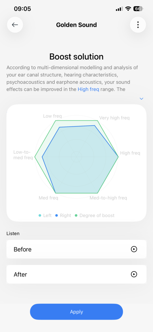 I can't help but mention one of my favorite features - Golden Sound. It plays sounds of various ranges and creates an individual equalizer based on each person's hearing and preferences. After this calibration, music sounds brighter, cleaner and more balanced - better than with the factory settings.