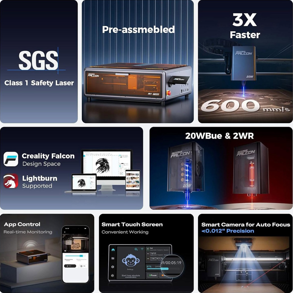 Creality Falcon A1 Pro 20W – pažangus lazerinis graviravimo ir pjovimo įrenginys, skirtas kūrėjams, dirbtuvėms ir mažam verslui. 20W diodinis lazeris ir iki 600 mm/s darbo greitis užtikrina tikslų ir greitą graviravimą bei pjovimą. Apie 268 × 358 mm darbo zona, automatinis fokusavimas ir integruota kamera leidžia lengvai paruošti tikslius projektus.