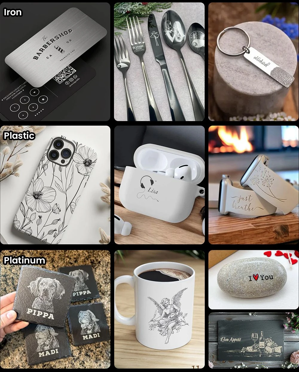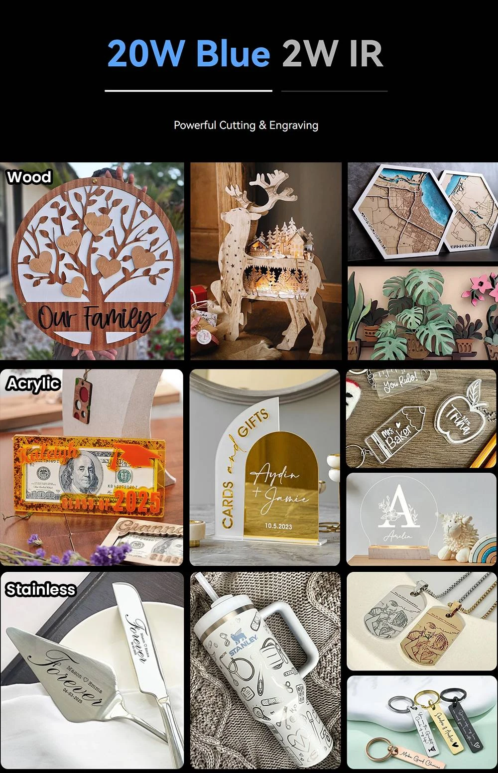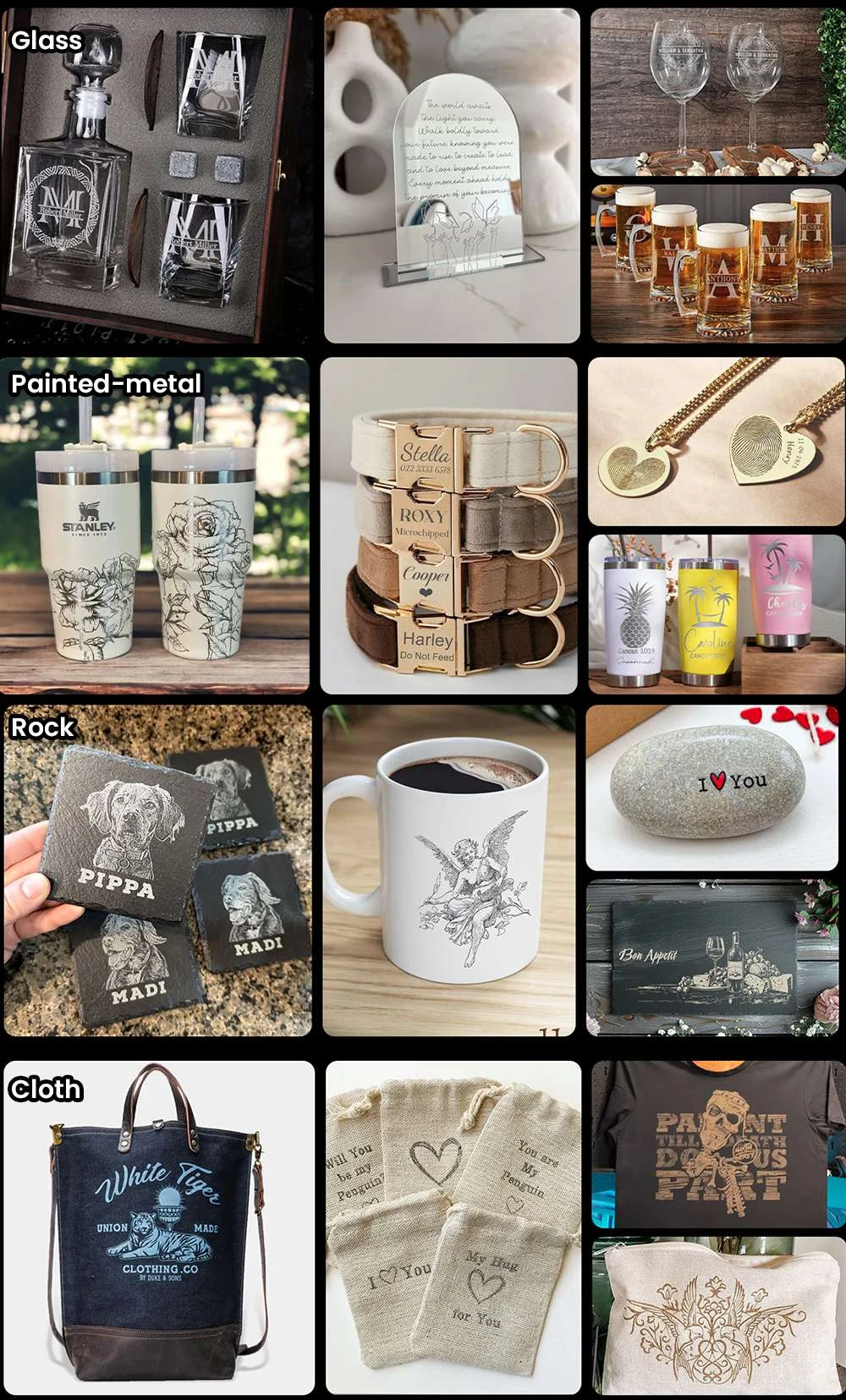 Įrenginys tinka darbui su mediena, akrilu, oda, plastiku, gumomis ir padengtais metalais. Juo galima gaminti vardines lenteles, iškabas, dekoracijas, personalizuotas dovanas, odinius aksesuarus ar verslo logotipus. Uždara konstrukcija ir galimybė prijungti dūmų ištraukimą užtikrina saugų ir patogų naudojimą patalpose. Dėl automatinio fokusavimo, kameros ir programinės įrangos palaikymo įrenginys yra lengvai įvaldomas net pradedantiesiems.