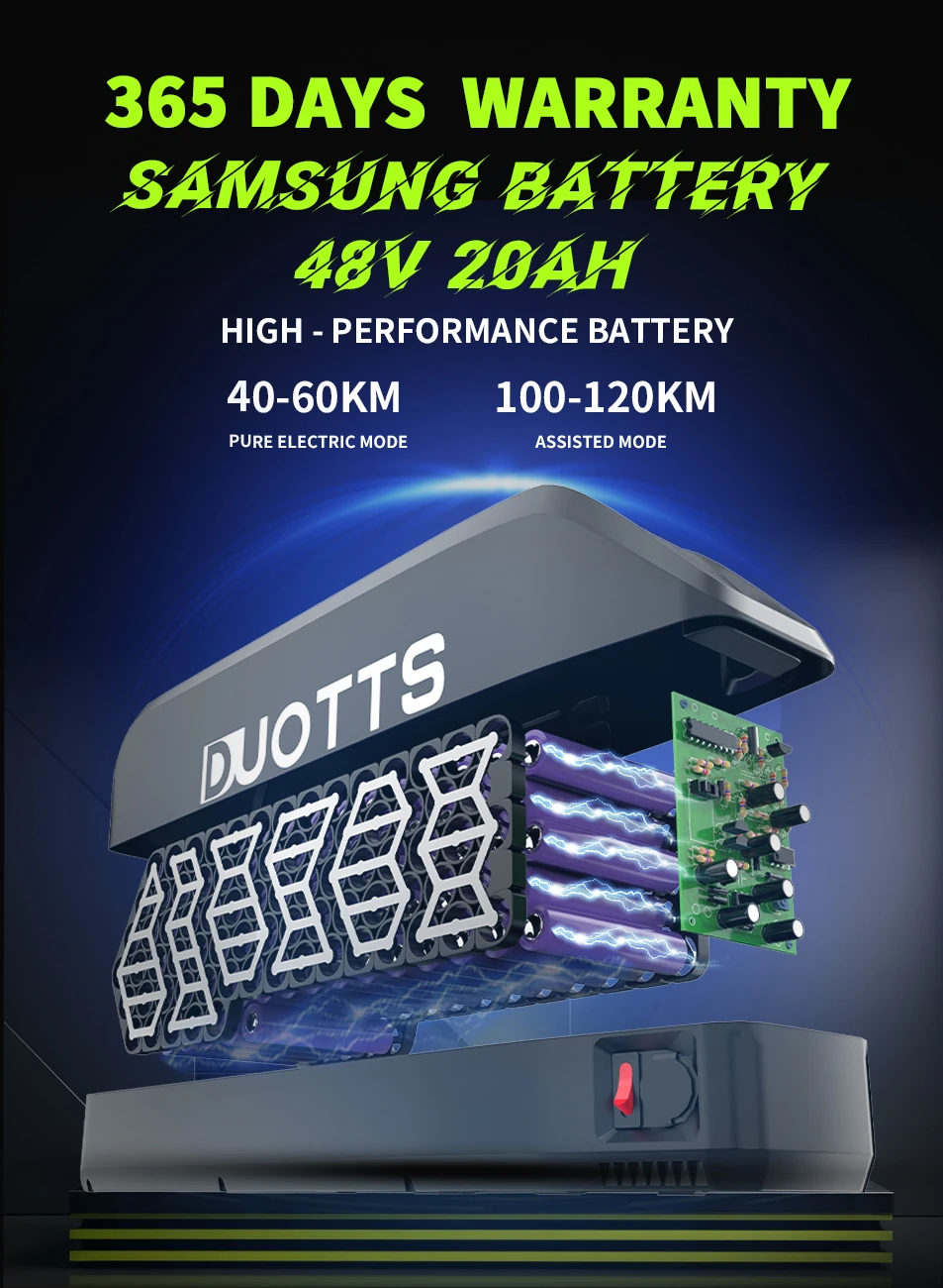 Dviratis komplektuojamas su SAMSUNG 48V 20Ah baterija, kuri pasižymi patikimumu ir ilgaamžiškumu. Ši baterija yra ištraukiama, todėl ją galima patogiai įkrauti tiek namuose, tiek biure. Integruota išmani BMS sistema užtikrina baterijos apsaugą nuo perkrovos bei perkaitimo. Vienu įkrovimu galima nuvažiuoti nuo 80 iki 100 km, o baterijai suteikiama 1 metų garantija.