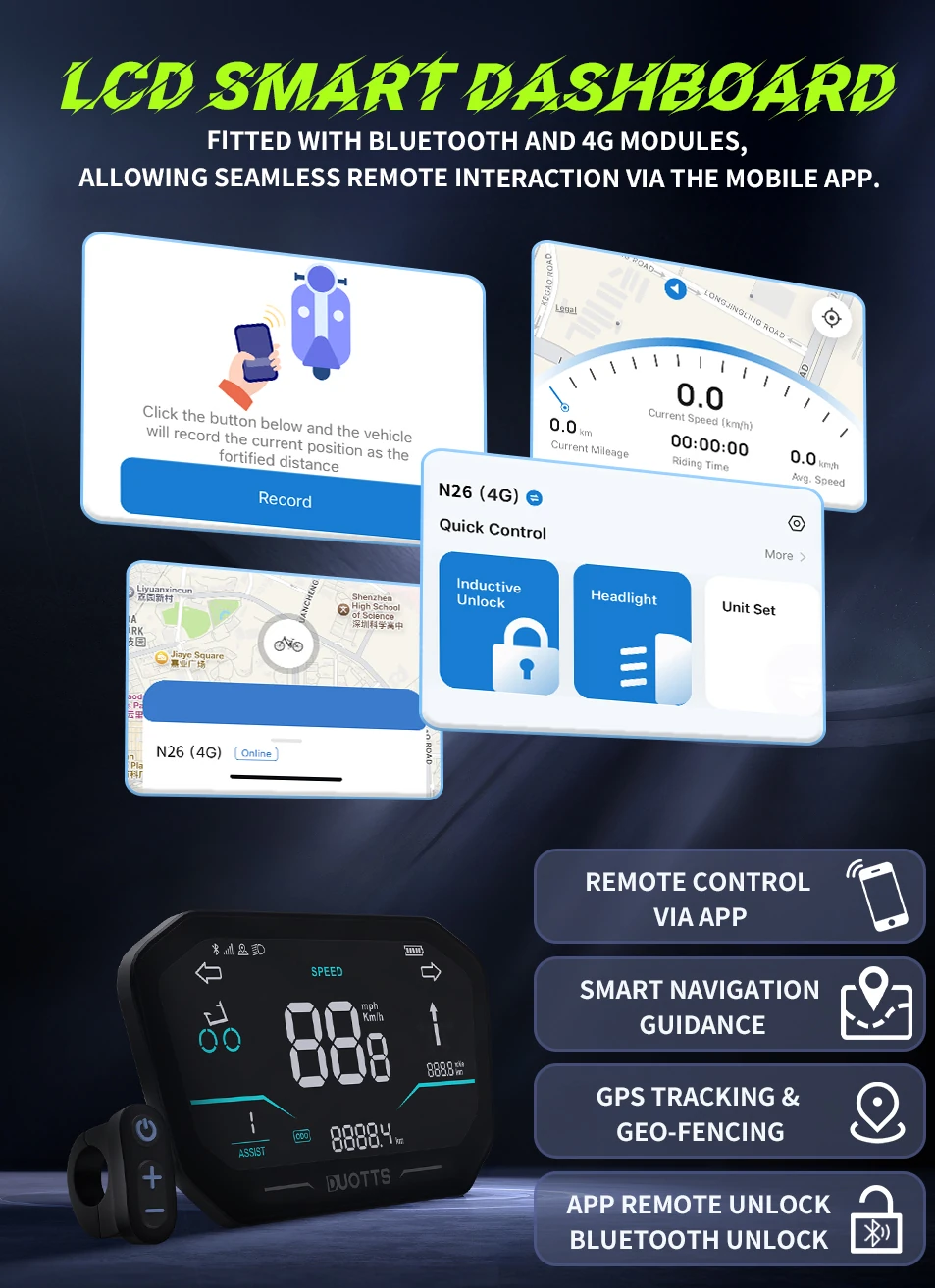 DUOTTS N26 elektrinis dviratis turi didelį LCD ekraną, kuris pateikia visą svarbiausią informaciją – greitį, nuvažiuotą atstumą bei baterijos likutį. Dviračio valdymas dar patogesnis dėl integruotos programėlės, GPS sekimo funkcijos bei galimybės atrakinti ar užrakinti jį naudojant „Bluetooth“ ryšį. Tai suteikia papildomo saugumo ir patogumo kiekvienam naudotojui.