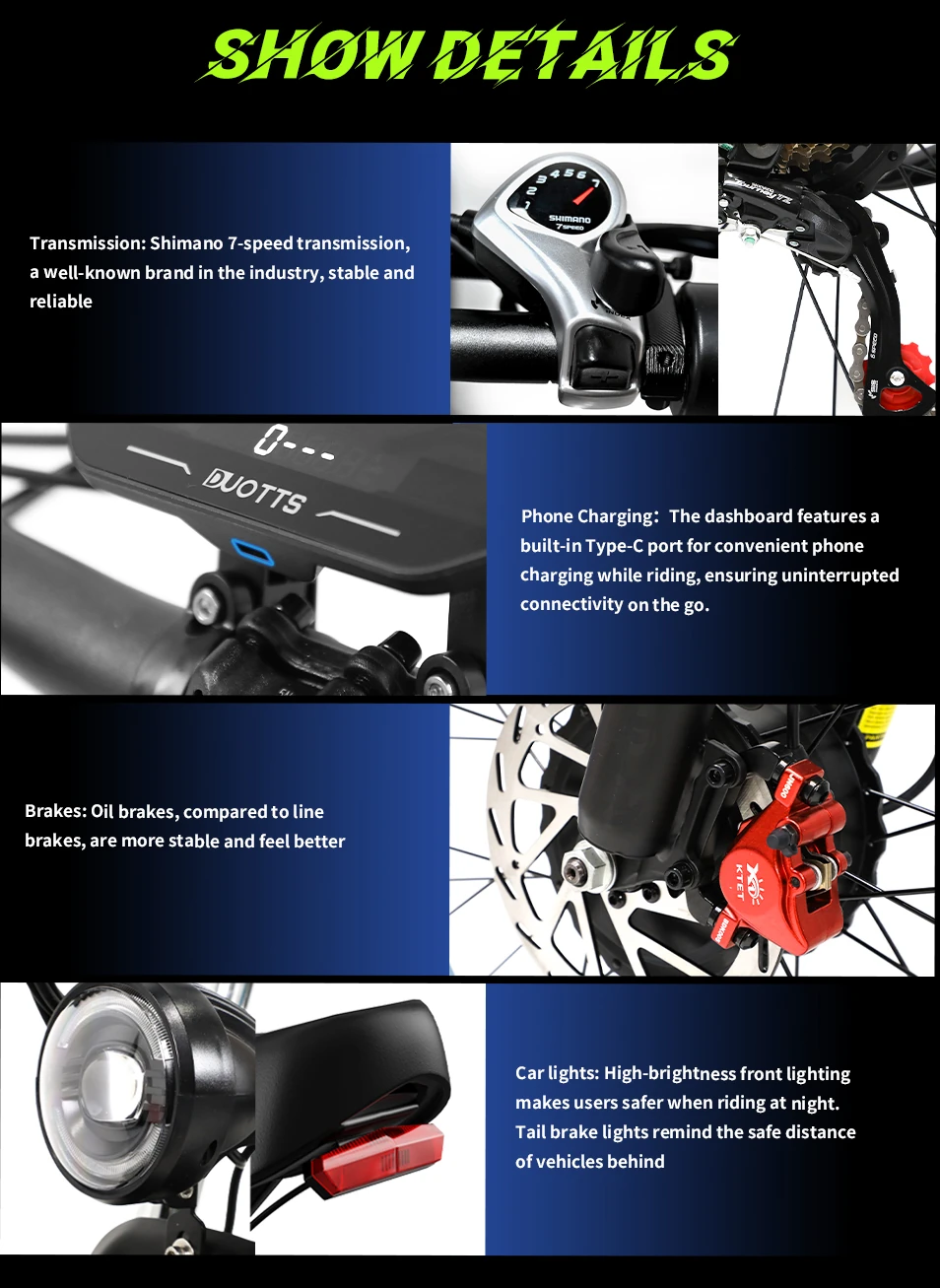 DUOTTS N26 taip pat pasižymi Shimano 7 pavarų sistema, kuri leidžia lengvai pritaikyti važiavimo intensyvumą pagal sąlygas. Integruota USB-C jungtis suteikia galimybę kelionės metu įkrauti išmanųjį telefoną ar kitus įrenginius. Hidrauliniai diskiniai stabdžiai užtikrina saugų stabdymą net ir važiuojant dideliu greičiu, o priekinis ir galinis žibintas su posūkių signalais garantuoja matomumą bei saugumą tamsiu paros metu.