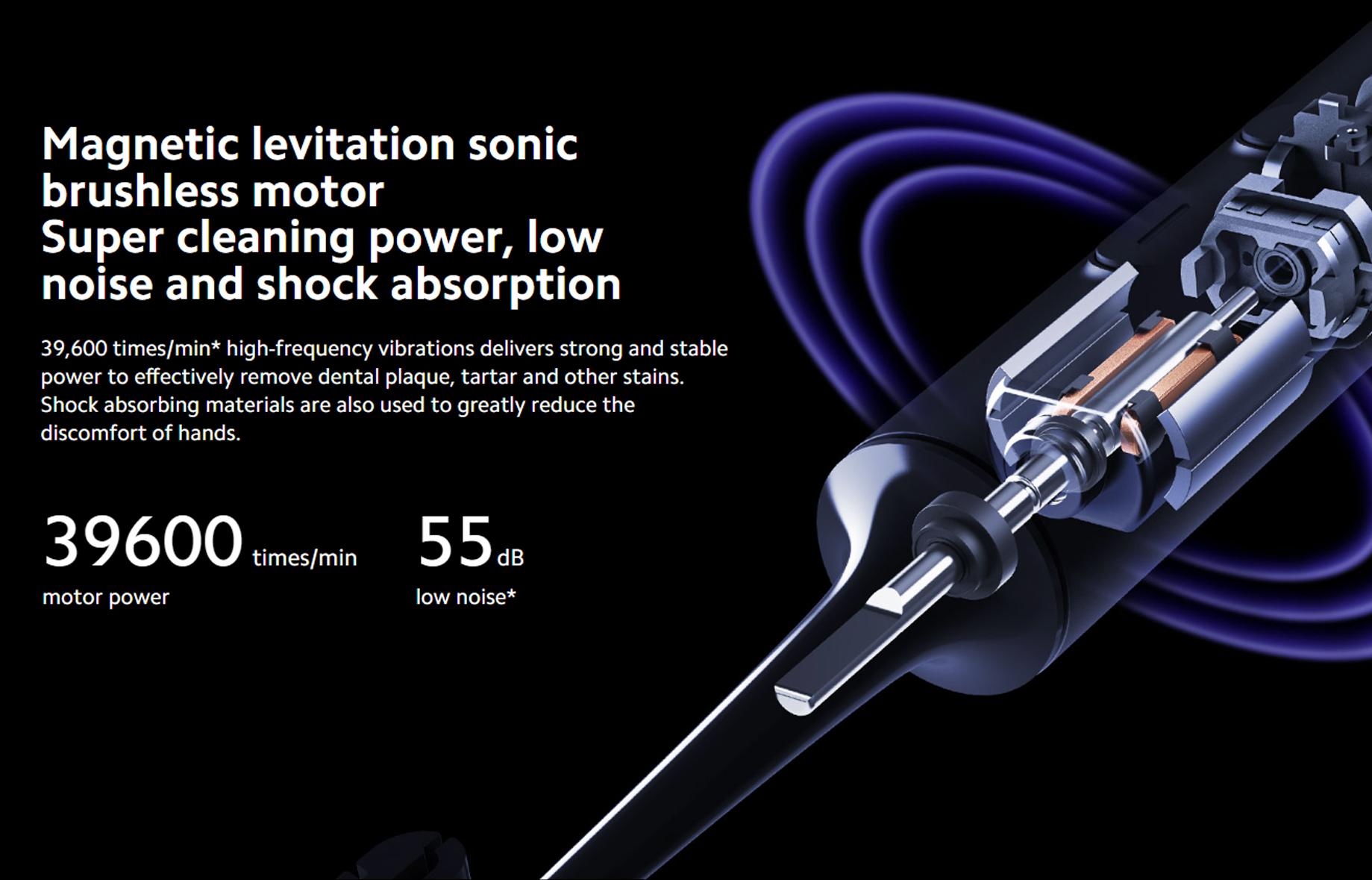 Xiaomi Mijia T700 aprūpintas aukštos kokybės magnetiniu varikliu, kuris pasiekia iki 39 600 apsisukimų per minutę. Toks greitis leidžia švelniai, bet itin efektyviai pašalinti apnašas ir maisto likučius net sunkiai pasiekiamose vietose. Nepaisant galingo veikimo, šepetėlis skleidžia vos apie 55 dB triukšmą, todėl valymas išlieka malonus ir tylus net anksti ryte.