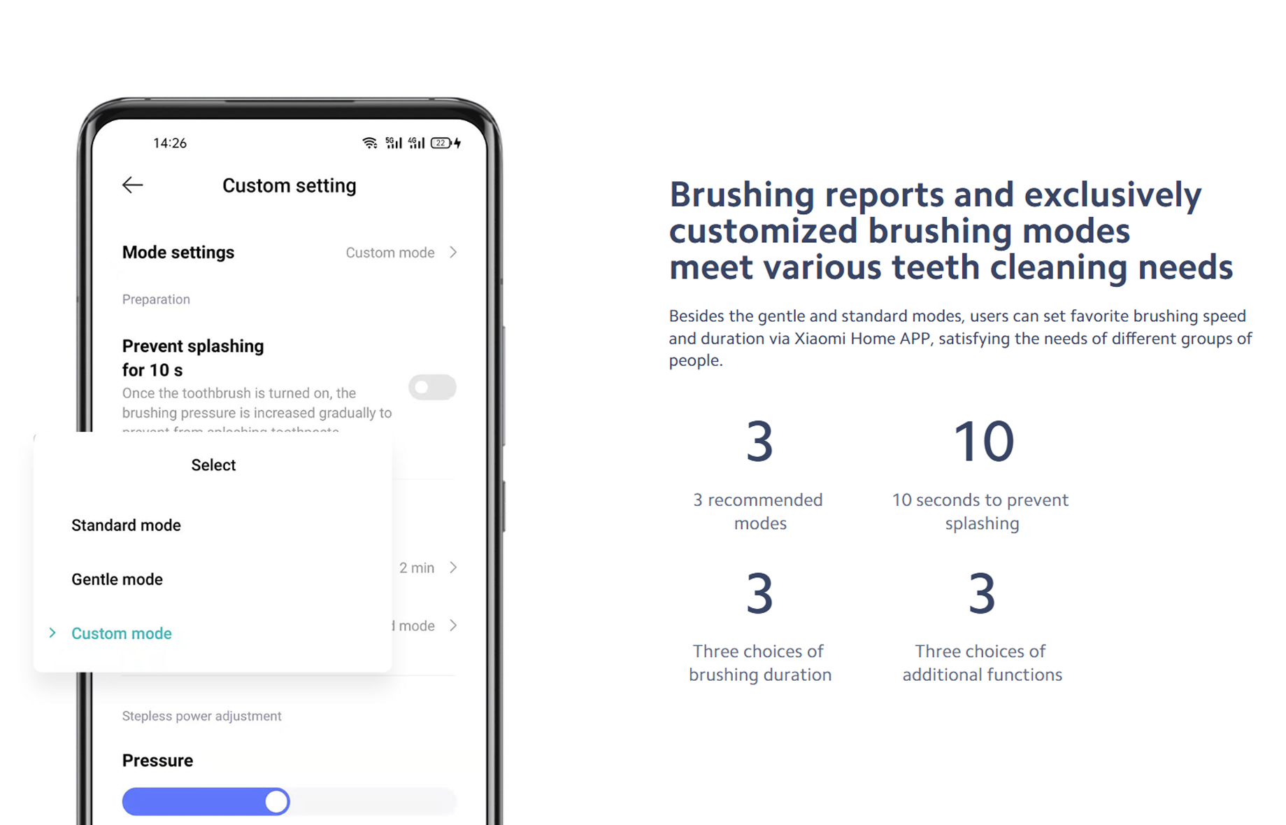 Naudodamiesi „Mi Home“ programėle, galite visiškai pritaikyti šepetėlio veikimą pagal savo poreikius. Programėlėje galima nustatyti valymo intensyvumą, trukmę bei stebėti kasdienius dantų valymo įpročius. Toks išmanus valdymas padeda palaikyti nuoseklią burnos higienos rutiną ir užtikrina optimalų valymo rezultatą kiekvieną kartą.