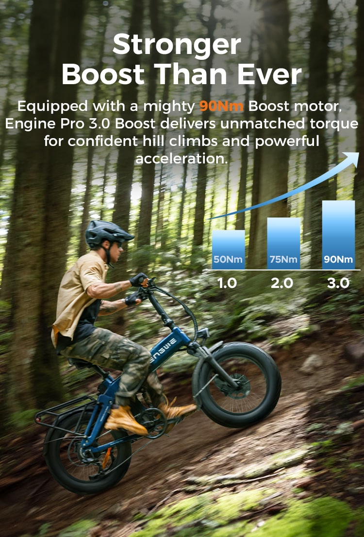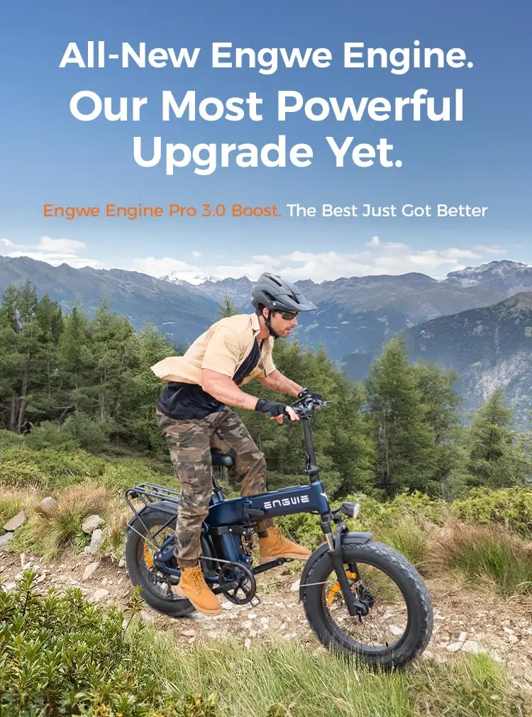 ENGWE Engine Pro 3.0 Boost – tai atnaujinta ankstesnio Engine Pro 2.0 versija, orientuota į didesnį našumą ir išmanias technologijas. Pagrindiniai patobulinimai – didesnis variklio sukimo momentas, greitesnis baterijos įkrovimas ir pažangi apsaugos sistema su GPS. Modelis išlaiko sulankstomą konstrukciją ir 20x4.0" colių ratus, tačiau tampa labiau tinkamas intensyviam kasdieniam naudojimui.