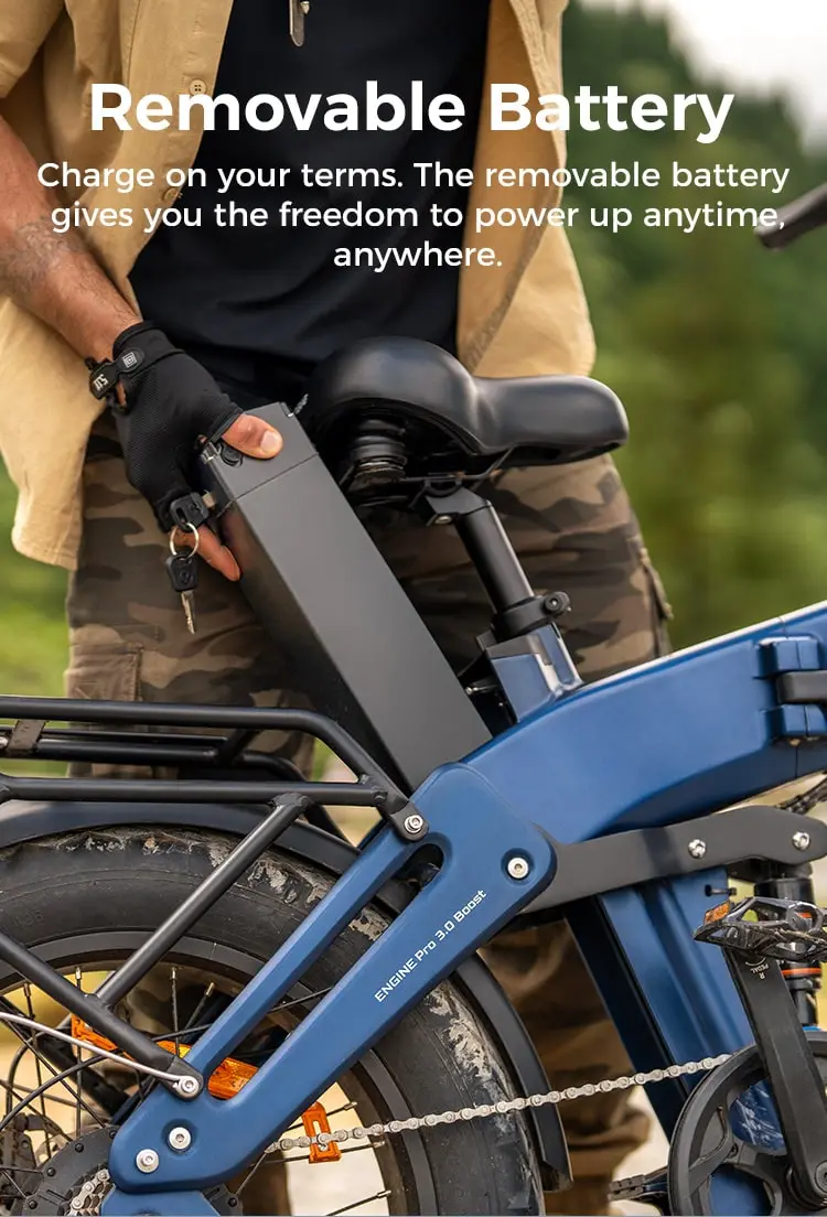 ENGWE Engine Pro 3.0 Boost baterija integruota rėme, tačiau ją galima lengvai išimti. Ji apsaugota mechaniniu užraktu, todėl sumažinama vagystės rizika. Tokia konstrukcija leidžia patogiai krauti bateriją namuose. Be to, bateriją lengviau saugoti nuo šalčio ar drėgmės ne sezono metu.