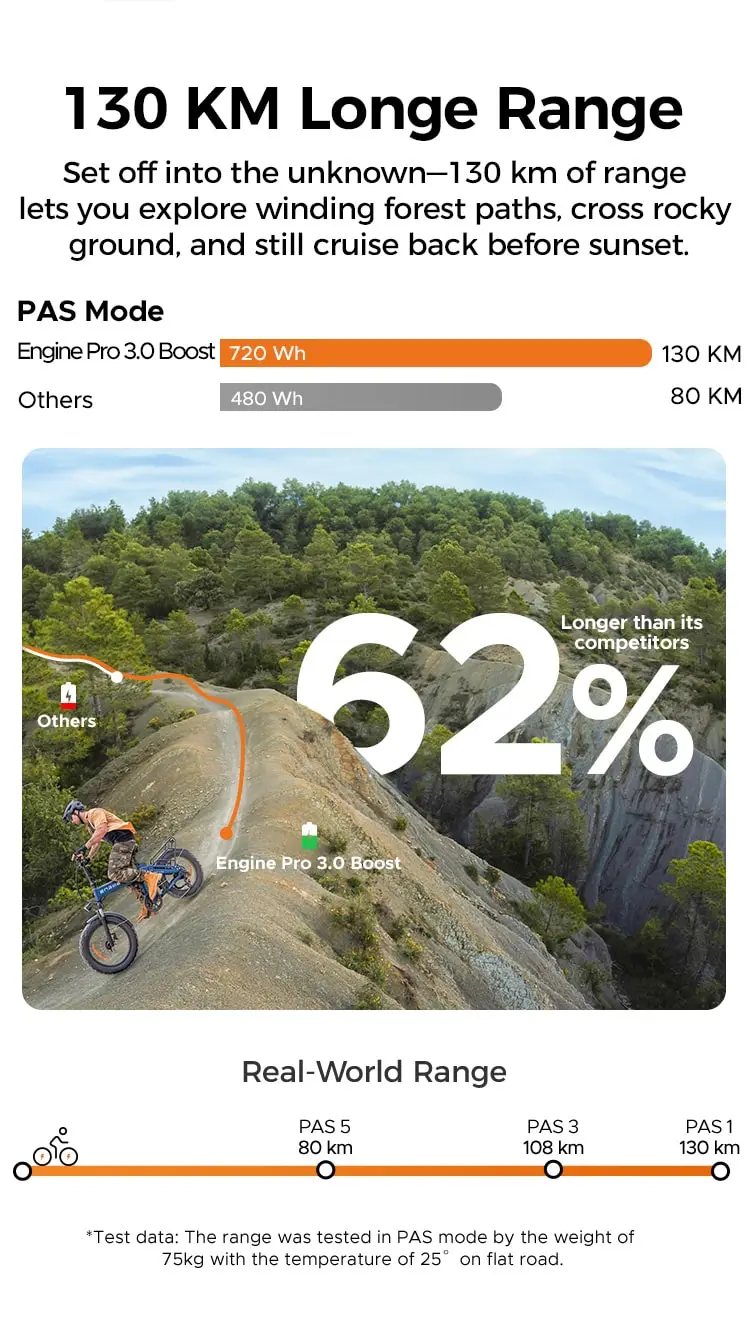Gamintojas nurodo, kad Engine Pro 3.0 Boost gali nuvažiuoti iki 130km naudojant žemiausią asistavimo lygį. Realiose sąlygose, priklausomai nuo svorio, reljefo ir važiavimo režimo, dažniausiai pasiekiama apie 60–80 km. Tai labai panašus arba šiek tiek geresnis rezultatas nei Engine Pro 2.0. Didelis privalumas – greita įkrova leidžia per dieną nuvažiuoti daugiau.