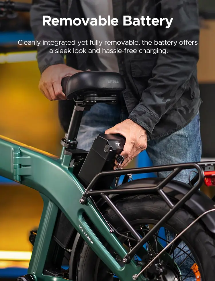 Elektriniame dviratyje sumontuota lengvai ištraukiama baterija, integruota į rėmą. Ją patogu išimti įkrovimui ar saugiam laikymui namuose ar ofise. Papildomas mechaninis užraktas apsaugo bateriją nuo vagystės, todėl dviratis tampa saugesnis naudoti viešose vietose. Toks sprendimas ypač vertinamas kasdien važinėjant mieste.