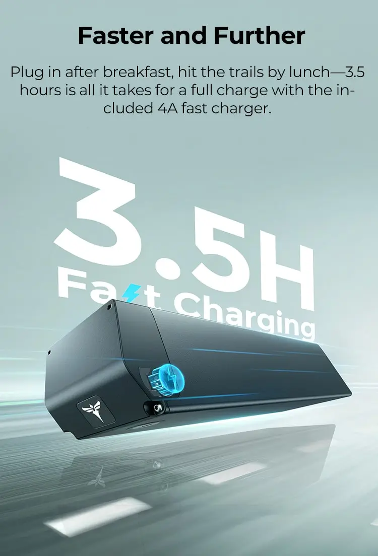 Baterija įkraunama naudojant komplekte esantį 54,6V 4A greito įkrovimo kroviklį. Oficialiais duomenimis, pilnas baterijos įkrovimas užtrunka apie 3,5 valandos, todėl dviratis greitai paruošiamas kitam važiavimui. Bateriją galima krauti tiek palikus ją dviračio rėme, tiek išėmus atskirai. Tai ypač patogu kasdieniam naudojimui, kai svarbus laikas ir lankstumas.