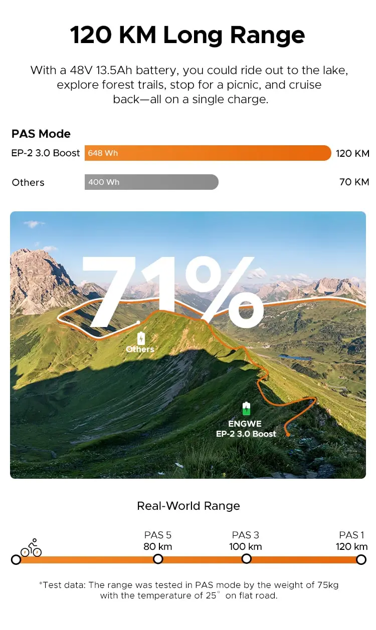 ENGWE EP-2 3.0 Boost komplektuojamas su 48V 13,5Ah (648Wh) ličio jonų baterija, kuri užtikrina ilgą važiavimo laiką. Priklausomai nuo pasirinkto PAS lygio, vienu įkrovimu galima įveikti iki 120km ekonomišku režimu. Naudojant vidutinius asistavimo lygius, atstumas puikiai tinka kasdienėms kelionėms į darbą ar laisvalaikiui. Aukštesni galios lygiai suteikia daugiau traukos, tačiau sumažina nuvažiuojamą atstumą.