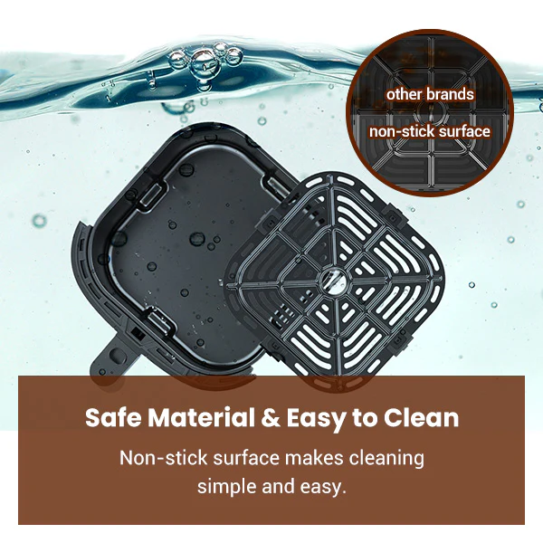 Kepimo krepšelis ir grotelės padengti nelimpančia danga, todėl jie lengvai valomi net po intensyvaus naudojimo. Šie elementai yra saugūs plauti indaplovėje, tad priežiūra tampa greita ir paprasta.