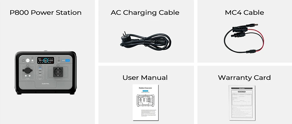 EU versijos specifikacijoje nurodoma 1 AC lizdas, 2 USB-C jungtys, 1 USB-A jungtis, 1 automobilinė jungtis ir 2 DC išėjimai. Komplekte pateikiama pati P800 stotelė, AC įkrovimo laidas, MC4 laidas, naudotojo vadovas ir garantinė kortelė. Toks komplektas leidžia pradėti naudoti įrenginį iškart, o saulės įkrovimui jau yra reikalingas MC4 kabelis.