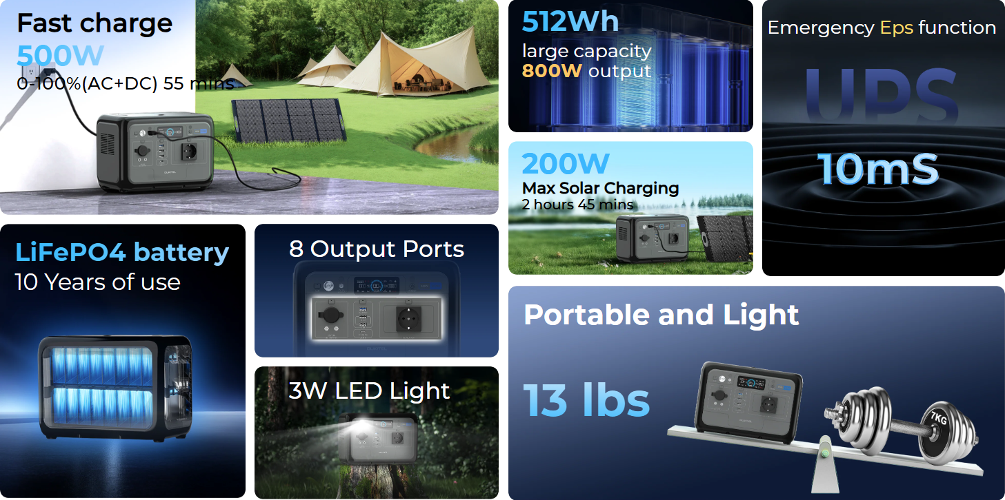 Šis modelis siūlo 800W nominalią galią ir 512Wh baterijos talpą, todėl gali maitinti ne vieną įrenginį vienu metu. Viduje naudojama LiFePO4 baterija, o korpuse integruoti 8 išėjimai skirtingiems įrenginiams. Papildomai čia yra EPS režimas su mažesniu nei 10ms persijungimu ir 3W LED lemputė.