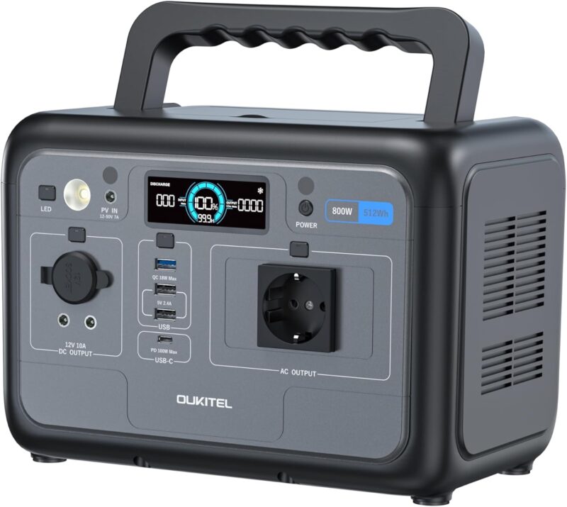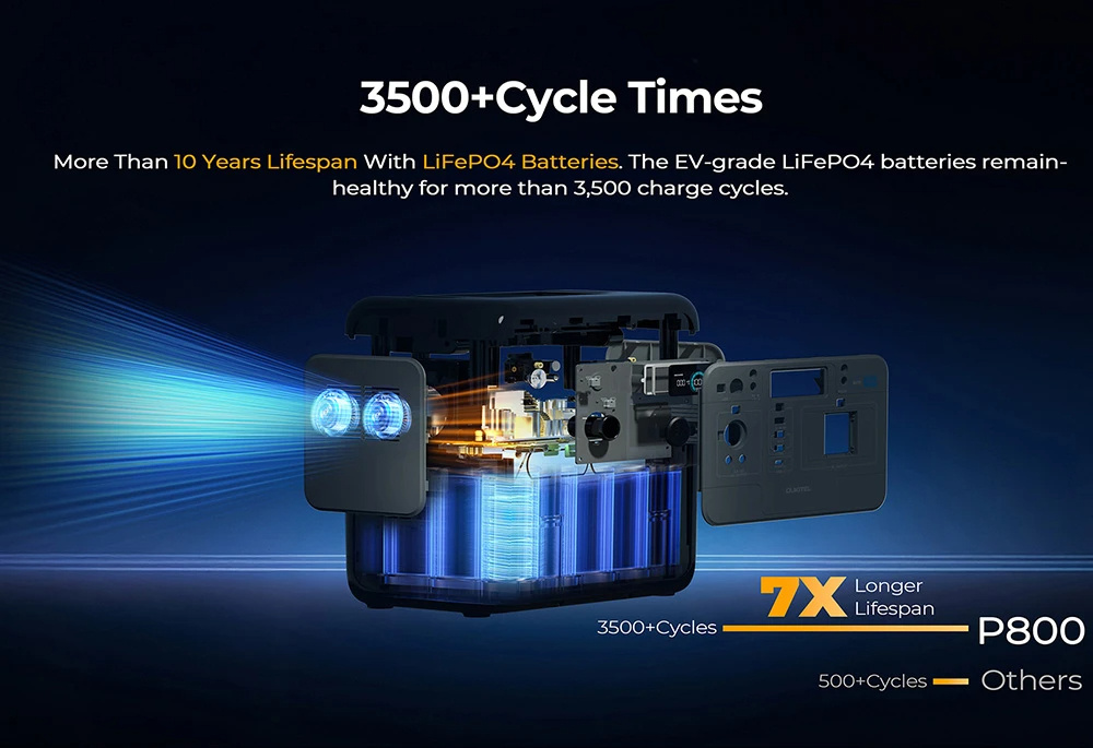 Oukitel P800 turi 512Wh LiFePO4 bateriją, kuri išsiskiria ilgesniu tarnavimo laiku nei įprasti sprendimai. Gamintojas nurodo iki 3500 įkrovimo ciklų, kol baterija išlaiko apie 80% pradinės talpos. Praktikoje tai reiškia ilgaamžiškesnį ir ramesnį naudojimą tiek namuose, tiek reguliariose išvykose.