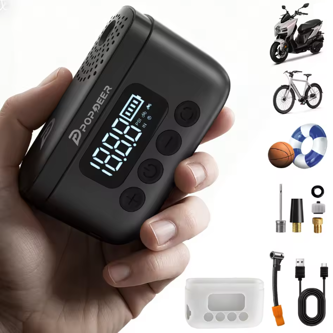 POPDEER P-T01 – mini elektrinė pompa, skirta greitai prisipūsti dviratio padangą kelyje, kai nenori tampytis rankinės pompos. Maksimalus slėgis siekia iki 150 PSI, todėl ji tinka ir aukštesnio slėgio plentiniams dviračiams. Pagal realius pavyzdžius 700×25C padangą nuo 0 iki 80PSI gali pripūsti maždaug per 50s, o iki 110 PSI – apie 90s.