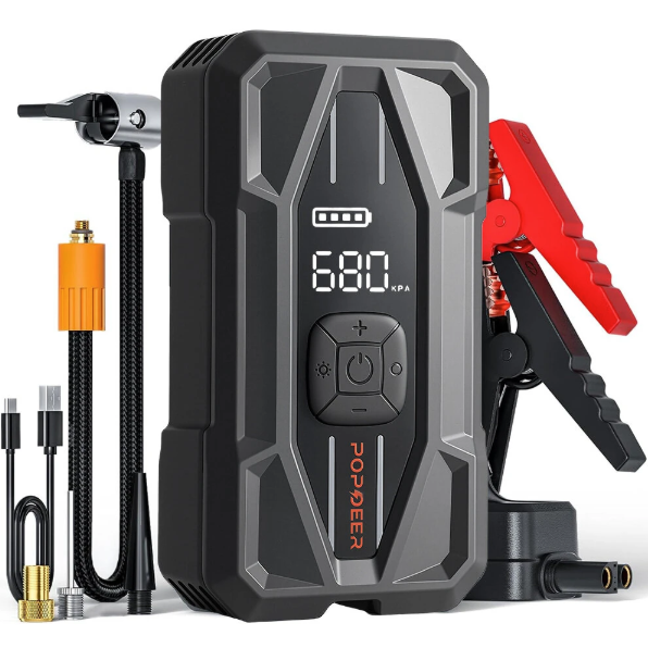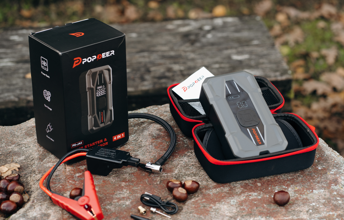 POPDEER PD-JA5 5000A 4‑in‑1 avarinis starteris su oro kompresoriumi yra išmanus ir pilnai paruoštas naudoti įrenginys, kuris viename korpuse apjungia keturias funkcijas: automobilio paleidimą, padangų pripūtimą, žibintuvėlį ir išorinį akumuliatorių su LCD ekranu.