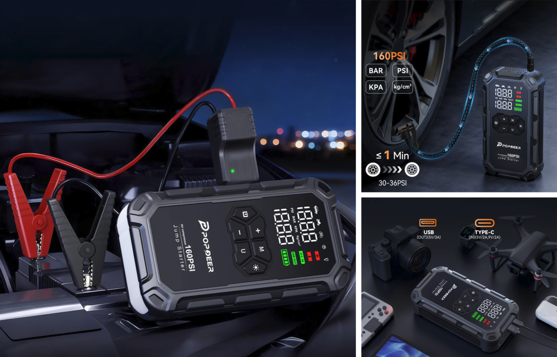 Popdeer PD-JA66 yra 2-in-1 įrenginys: automobilio užvedėjas ir oro kompresorius viename korpuse. Jis skirtas situacijoms, kai reikia greitai užvesti automobilį arba pripūsti padangą kelyje. Patogu tai, kad vienas įrenginys užima mažiau vietos nei atskiras booster’is ir atskiras pompavimo kompresorius.