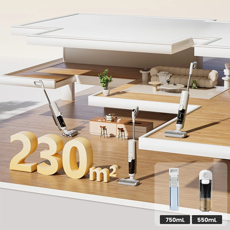 Modelis turi 750 ml švaraus vandens ir 550 ml nešvaraus vandens rezervuarus, tad vienu kartu galima išvalyti didesnį plotą be dažno papildymo. Čia naudojama 28.8V baterija, kurios pakanka iki 60 minučių darbo. Vienu įkrovimu siurblys gali padengti maždaug iki 230 m² plotą, todėl tinka ne tik mažesniems butams, bet ir didesnėms erdvėms.