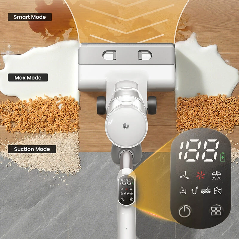 Proscenic F10 Ultra yra 3-in-1 plaunantis dulkių siurblys, kuris vienu metu siurbia, plauna ir padeda greičiau nusausinti grindis. 350W variklis išvysto iki 18 000 Pa siurbimo galią, todėl modelis gerai tvarkosi tiek su kasdieniais nešvarumais, tiek su sunkesnėmis dėmėmis. Siurblys turi 3 darbo režimus: Smart, Max ir skysčių surinkimo režimą.