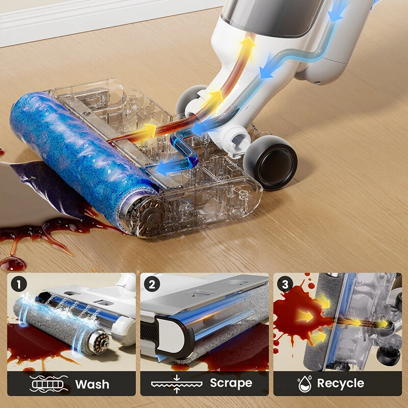 Šis modelis grindis valo švariu vandeniu, o nešvarus vanduo iškart surenkamas į atskirą rezervuarą, todėl valoma ne ta pačia purvina drėgme. 550 RPM greičiu besisukantis volelis padeda atkabinti nešvarumus nuo grindų paviršiaus, o siurbimo sistema juos iškart surenka. Toks veikimo principas patogus tuo, kad vienu pravažiavimu galima ir surinkti šiukšles, ir nuvalyti drėgnus nešvarumus.