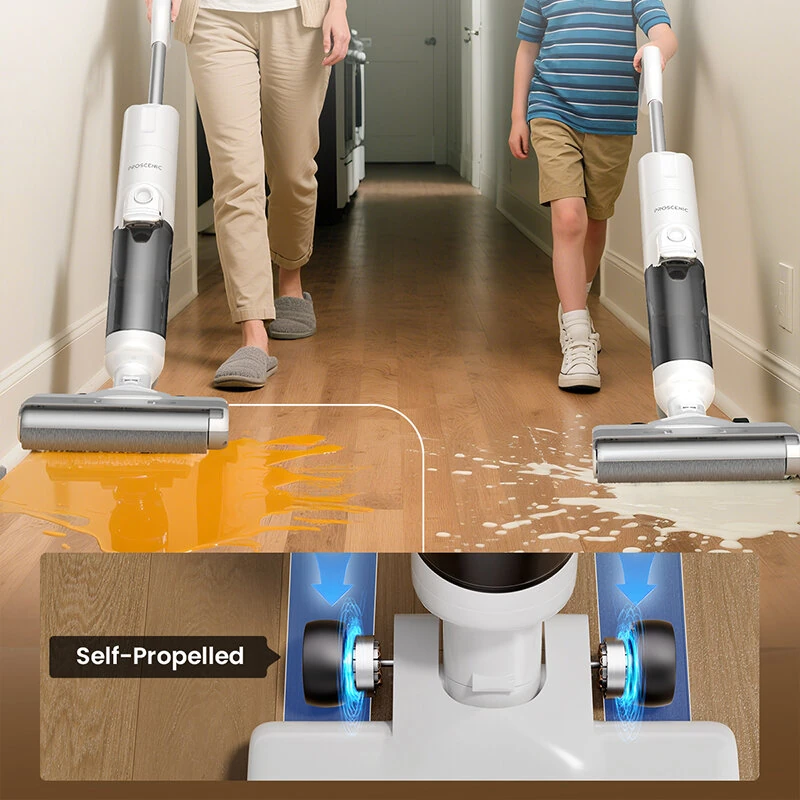 Proscenic F10 Ultra turi savaeigę judėjimo sistemą, todėl siurblį stumti ir traukti yra lengviau nei įprastą modelį. Paprastai tariant, besisukantis valymo mazgas padeda siurbliui judėti pirmyn, todėl rankai tenka mažesnė apkrova. Toks sprendimas ypač patogus valant didesnius plotus, manevruojant aplink baldus ir kasdien naudojant siurblį ilgesnį laiką.