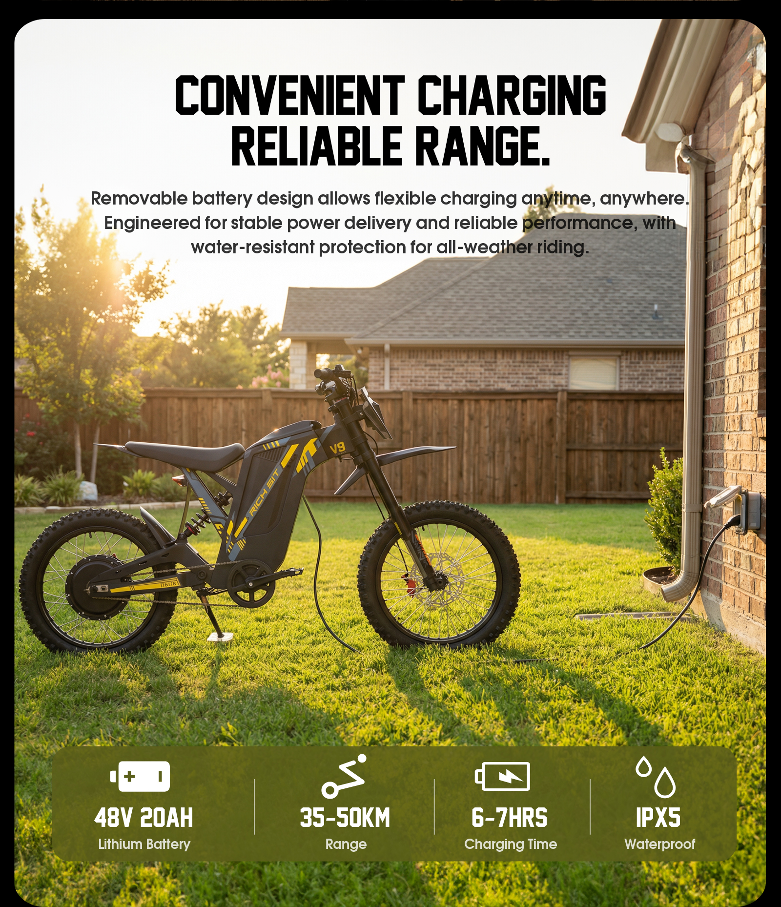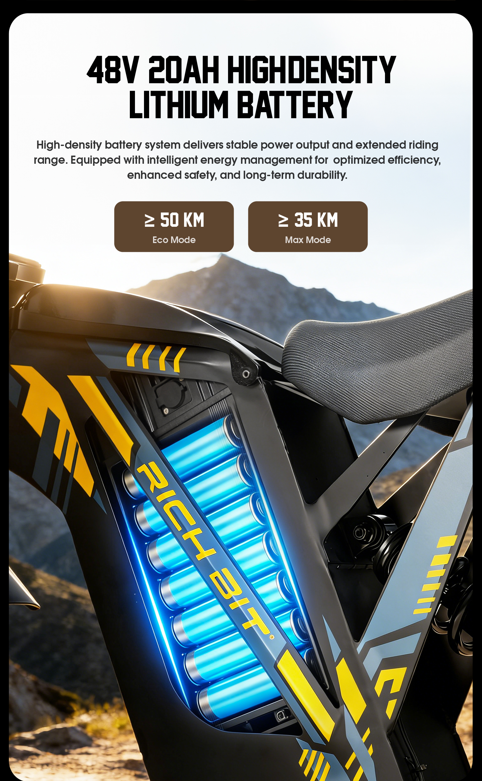 RICH BIT V9 Ultra turi ištraukiamą 48V 20Ah ličio bateriją, todėl ją galima patogiau krauti atskirai nuo motociklo. Pilnas įkrovimas trunka maždaug 6–7 valandas, o pats sprendimas patogus kasdieniam naudojimui namuose ar garaže.