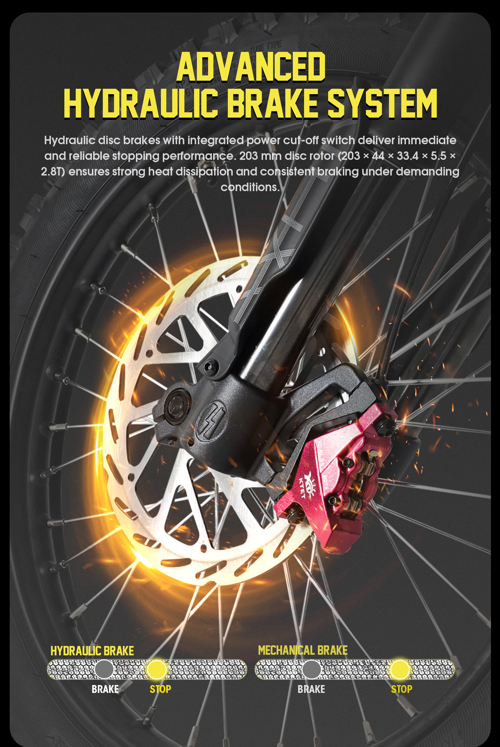 RICH BIT V9 Ultra naudoja hidraulinius diskinius stabdžius su integruotu galios atjungimo jungikliu. Toks sprendimas padeda greičiau ir tiksliau sustabdyti motociklą, ypač važiuojant didesniu greičiu ar sudėtingesniu paviršiumi. Papildomai akcentuojamas 203 mm stabdžių diskas, kuris geriau tvarkosi su šilumos išsklaidymu ir stabdymo stabilumu.